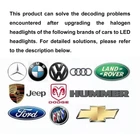 Store Categories Store Categories Lighting & Lamps LED Headlights Other Lighting Accessories Sensors Oxygen O2 Sensors Temperature Sensors TPMS Sensors Knock Sensors Other Sensors Pressure Sensors Other Accessories Parking Cameras Parking Cameras-Owl SY Autoparts QPKD Autoparts QPKD Autoparts-TPMS QPKD Autoparts-O2 QPKD Autoparts-Uncategorized WIT Autoparts WIT Autoparts-CAM-Main WIT Autoparts-CAM-Temp WIT Autoparts-LED WIT Autoparts-CAM-Part 3 Other 2× H13/9008 LED Headlight Canbus Decoder Error Anti Flicker Resistor Canceller Product Description Im portant Notes Before Purchase: Before making a purchase, kindly consider these recommendations for a seamless experience : 1. C ompatibility List may NOT be 100% accurate OR up to date as it might not cover all applicable vehicle models; it's intended for reference purposes only. 2. If you're uncertain about component compatibility with your vehicle, you can consider the following methods: - Check Vehicle Manual: Check your assembly or refer to your owner's manual for OEM part numbers of auto parts. - Consult Seller : To confirm, provide the seller with your vehicle's informations (Year / Make / Model / Trim / Engine). Please follow the above guidelines to make your purchase. If you have any questions, please contact the seller or check the F AQ . Key Feature s and Advantages: N/A Technical Specification: N/A Product Description: This product can solve the decoding problems encountered after upgrading the car's halogen lamps to LED headlights: 1. After changing the halogen lamps to LED headlights, the headlights flicker frequently when starting the car (left headlight flickers twice and right headlight flickers twice). 2. After upgrading the halogen lamps to LED headlights, there is an error code on the instrument panel when the car headlights are turned on (showing that the car headlights do not work or showing that the car headlights are defective). 3. After upgrading the halogen lamps to LED headlights, the car FM radio has obvious noise interference, and the reversing influence display has obvious image interference. 4. After upgrading the halogen lamps to LED headlights, the car headlights only flicker when turning on, then the headlights turn off (it is not a problem of the car headlights, it is the car system detecting the replacement of the car headlights, it feels strange and refuses to turn on the car lights). 5. After upgrading the halogen headlights to LED headlights, the LED headlights flicker and light up like eyes when the car drives on the road. Many car brands often have halogen headlights instead of LED headlights when new from the factory because their LED headlights are too expensive for the average car under $30,000 and are not cost effective for those buying the car. This product can help car owners solve the problem for very little money. The above five anomalies can cause damage to the car if left unresolved for a long time and can also be dangerous when driving. This product can help you solve the above problems and the price of this product is very low. Compatibility: 1. Prior to making a purchase, kindly verify that the BASE PLUG or OEM number of the auto parts for your vehicle corresponds to H13 (9008) or the I nterchange Part Number . 2. For Jee p, Dodge, Raptor, Hummer, if the LED headlight model is H13, 9008, you need to add a pair of 22W resistors to solve the decoding problem together with this product. You can send us a message stating your vehicle's informations (Year/ Make/ Model/ Trim/ Engine) and LED headlight model and we will reply you with the perfect solution within 24 hours. Suit for LED headlight type Applicable products For Mercedes-Benz, BMW, Volkswagen, Audi, Land Rover, Porsche and other high quality cars. H13 (9008) This canbus product 9004 (HB1), 9007 (HB5) Another canbus product H4 (HB2, 9003) Another canbus product H8, H9, H10, H11, 880, 881 Another canbus product H1, H3, H7 Another canbus product 9005 (HB3), 9006 (HB4) Another canbus product Suit for LED headlight type Applicable products For Jee p, Dodge (except Dodge Avenger cars), Raptor, Hummer H13 (9008) Add a pair of 22W resistors and this canbus product 9004 (HB1), 9007 (HB5) Add a pair of 22W resistors and another canbus product H4 (HB2, 9003) Add a pair of 22W resistors and another canbus product H8, H9, H10, H11, 880, 881 Another canbus product H1, H3, H7 Another canbus product 9005 (HB3), 9006 (HB4) Another canbus product Suit for LED headlight type Applicable products For Ford, Buick, Chevrolet H13 (9008) This canbus product 9004 (HB1), 9007 (HB5) Another canbus product H4 (HB2, 90 03 ) Another canbus product H8, H9, H10, H11 , 880, 881 Another canbus product H1, H3 , H7 Another canbus product 9005 (HB3 ) , 9006 (HB4) Another canbus product Installation Instructions: 1. With the original bulb, reset. 2. After it is normal, turn off the engine and install the decoder and LED lights. 3. Turn on the lights after starting the car, wait for 5 minutes and then try to change the far and near lights to see if it is normal. Package Contents: 2× H13 (9008) LED wiring decoder adapters Frequently Asked Questions: Please refer to " FAQ " for more information. Payment Policy Shipping Policy Warranty & Returns Policy About Feedback FAQ Payment Policy PayPal payment accepted only. Items will be shipped to your eBay address. Please make sure it is correct. Payment must be received 4 days after auction ended. Shipping Policy Quality Assurance - All items undergo a thorough inspection before the packaging process. Each item is guaranteed to be brand new and of exceptional quality. Timely Shipping - Upon receiving your payment, we will ensure your order is shipped within 3 business days, excluding weekends and public holidays. Domestic (U.S.) Shipping - We exclusively utilize USPS or UPS for shipping. This method typically entails a delivery period of approximately 7-10 working days. You will also have the convenience of tracking your shipment o