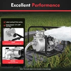 Description Are you still worried about watering your farm too slowly? This 6.5HP irrigation water pump will help you get your watering done very quickly and well. It has an aluminum pump body for greater durability and long service life. The extra power and large flow rate will allow you to work more efficiently. Key Features Great Durability: It is mainly made of high-quality aluminum and iron, and has undergone spraying and welding processes, so it has good wear resistance, corrosion resistance, high temperature resistance, and impact resistance, making it very sturdy and durable. High Efficiency: It adopts a powerful four-stroke OHV engine, which can generate more power. The 6.5hp, 210cc engine has a high speed of 3600r/min, achieving a 1271.33ft³/h hourly flow rate, 23ft self suctio 2" Inch 6.5HP Gas Water Semi Trash Pump Gas-Power Water Irrigation Transfer Pump 2" Inch 6.5HP Gas Water Semi Trash Pump Gas-Power Water Irrigation Transfer Pump Description Are you still worried about watering your farm too slowly? This 6.5HP irrigation water pump will help you get your watering done very quickly and well. It has an aluminum pump body for greater durability and long service life. The extra power and large flow rate will allow you to work more efficiently. Key Features Great Durability: It is mainly made of high-quality aluminum and iron, and has undergone spraying and welding processes, so it has good wear resistance, corrosion resistance, high temperature resistance, and impact resistance, making it very sturdy and durable. High Efficiency: It adopts a powerful four-stroke OHV engine, which can generate more power. The 6.5hp, 210cc engine has a high speed of 3600r/min, achieving a 1271.33ft³/h hourly flow rate, 23ft self suction height, and 92ft lift. and efficiently completing various irrigation and drainage tasks in a shorter amount of time. Long-term Endurance & Energy Saving: The 0.95gal fuel tank allows you to work for a longer time at once, saving you time and effort. A high-quality carburetor allows for better fuel combustion, ensuring a fuel consumption rate of 360ml/kw.h, and reducing fuel consumption. Good Heat Dissipation: The forced air-cooling system and the dense cooling holes in the casing dissipate heat quickly and promptly, which not only prolongs the engine's service life but also ensures that the engine will not stall even after a long period of operation. Thoughtful Design: The sturdy frame, quadrilateral base, and enlarged anti-slip pads provide greater stability and effective vibration reduction, ensuring better performance in harsh environments. Easy Operation: The design of manual start, one-click shutdown, and controllable speed simplifies various operations while ensuring safety, making it easier and more reassuring for you to use. Low Noise: The quality silencer can effectively alleviate the noise generated during the operation process, control the noise within an acceptable range(about 96dB), and provide a comfortable working environment. Protective Package: To prevent the product from being damaged and bumped during transportation, we packed it with sponges, bubble bags, plastic bags and carton to protect your products to the maximum extent possible. Customer Service: Communication is the best way to solve problems. If you have any problems, please feel free to contact us. We will reply and solve the problem for you as soon as possible. Details Enlarged Inlet and Outlet: Its inlet and outlet have been enlarged to a diameter of 2 inches, which allows for a larger flow rate for a wider range of watering and suction. Air & Water Filters: The filters can effectively isolate impurities in water and air, prevent blockage of water pipes and water pumps, and improve working efficiency. Snap-on Fuel Tank Cap : It makes the fuel tank seal better, reduces evaporation, and saves fuel. Application It can be used for agricultural irrigation, treatment of industrial wastewater, tunnel drainage, road cleaning, alpine water conveyance, flood control and drainage, engineering construction, water extraction from machine wells, fire-fighting water, fishpond aquaculture, and so on. Initiation Step Switch to "ON". Connect the inlet hose and filter. Close the damper and open the gasoline switch. Start the machine. Open the damper. Adjust the speed control seat. Water Pipe Installation Step 1. Place the gasket in the joint. 2. Rotate to install the joint and tighten it. 3. Install the water pipe clamp. 4. The installation is completed. Specifications Material: Aluminum, Iron, Plastic Process: Spray Molding, Welding Color: Red Engine Type: Single-cylinder, 4-stroke, Air-cooled Starting Mode: Manual Power: 4.8kw Horsepower: 6.5hp Fuel Type: Gasoline Fuel Tank Capacity: 3.6L/0.95Gal Fuel Consumption Rate: 360ml/kw.h Engine Oil Capacity: 0.6L/0.16Gal Speed: 3600rpm Displacement: 210cc Noise: About 96dB Intake and Outlet Diameter: 5cm/2inch Pump Lift: 28m/92ft Pump Output: 36m³/h/1271.33ft³/h (9510GPH) Self-suction Height: 7m/23ft Product Size: 46.2*36*38.7cm/18.19*14.17*15.24inch Package Size: 50.5*40.5*40.5cm/19.88*15.94*15.94inch Net Weight: 18.45kg/40.68lbs Gross Weight: 19.8kg/43.65lbs Package Included 1* Water Pump 1* Inlet Pipe Connection 1* Outlet Pipe Connection 1* Sleeve Rod 1* Filter 4* Foot Pads 1* English Manual Other Accessories for Assembly Notes Please fill the pump head with water before starting to avoid damaging the pump head. The machine needs to be filled with gasoline and four-stroke engine oil before use to prevent cylinder explosion due to insufficient lubrication and overheating. Please do not use the machine indoors or in a damp environment. Please keep the product away from inflammable items. Please turn off the machine and do not smoke when refueling. Please do not add excessive fuel to avoid potential danger caused by fuel overflow. Please read the manual completely before use, and pay particular attention to the safety instructions included. Please all