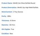 22 OZ 999 SILVER ROUND HIGH RELIEF BUFFALO BIZON HUGE COIN MintID.com TAP TO SCAN , No Reserve. This 2 oz MintID Buffalo Silver Round .999+ Fine with NFC Scan Authentication. Made with 2 troy ounces of .999+ fine silver, this is a MintID product that comes with a special, tamperproof NFC microchip. This special microchip is able to be scanned with your iOS or Android cellphone because it is linked to a cloud-based digital ID. This ID allows you to trace the scanning history of your silver rounds. When you buy silver rounds, take control of the security of your product. MintID is a company that holds the honor of manufacturing some of the world’s most secure bullion products. Each Buffalo silver round carries an AES-128 bit encryption microchip, which is completely attached to the round. This microchip meets the “Advanced Encryption Standard” (AES), which is US government-approved technology. The silver round’s microchip gives you access to authenticate your silver round at home for free with the MintID phone application. This can easily be found in your iOS or Android cellphone’s app store. After you scan your item through the application, you can access your product’s digital identity in the MintID Cloud. This allows you to trace the history of when and where your silver was scanned. And also, you do not have to worry about the microchip being removed because they are tamperproof, and the chip self-destructs if there has ever been any attempt to remove it. The obverse of the silver round showcases the American “buffalo” bison with the MintID logo beneath its head. Surrounding the buffalo is a crosshatch-style border. Inscriptions include the silver round’s weight and purity. The reverse of the MintID Buffalo silver round features the NFC microchip in the center. Behind that is a repeating pattern of the MintID logo and the same border found on the obverse. Inscriptions note the “TAP TO SCAN” instruction MintID website. You will NOT receive the exact item or with the same certificate number. This photograph is for reference purpose only. The actual item you will receive is guaranteed to be similar to that shown and exactly as described. Happy Bidding !!