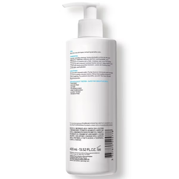 2 PACK La Roche-Posay Toleriane Hydrating Gentle Cleanser For Dry Skin 13.52 oz each EXP 10/2027 Description La Roche-Posay Toleriane Hydrating Gentle Face Cleanser for Normal to Dry Skin is a cream cleanser that helps skin retain essential moisture while cleansing. The cleanser maintains skin's natural protective barrier and pH. Infused with Prebiotic Thermal Water, Ceramide-3, Niacinamide & Glycerin. How to Use: 1. Wet skin with warm water. 2. Work face cleanser into a lather. 3. Massage into skin. 4. Rinse. Pat dry. Can be used on eye area. Highlights La Roche-Posay hydrating face wash for a daily skin care routine cleanses skin of dirt, makeup, and impurities Toleriane Hydrating Gentle Face Cleanser for dry skin to normal skin, and sensitive skin This Facial cleanser restores skin comfort and essential moisture and leaves skin feeling clean and hydrated Dermatologist tested daily facial cleanser Formulated with La Roche-Posay prebiotic thermal spring water, niacinamide, and ceramide-3, this face wash gently cleanses skin of dirt, makeup, and impurities while maintaining skin's natural moisture barrier and pH. Paraben-free, fragrance-free, sulfate-free, soap-free, allergy tested, non-comedogenic, and oil-free face wash