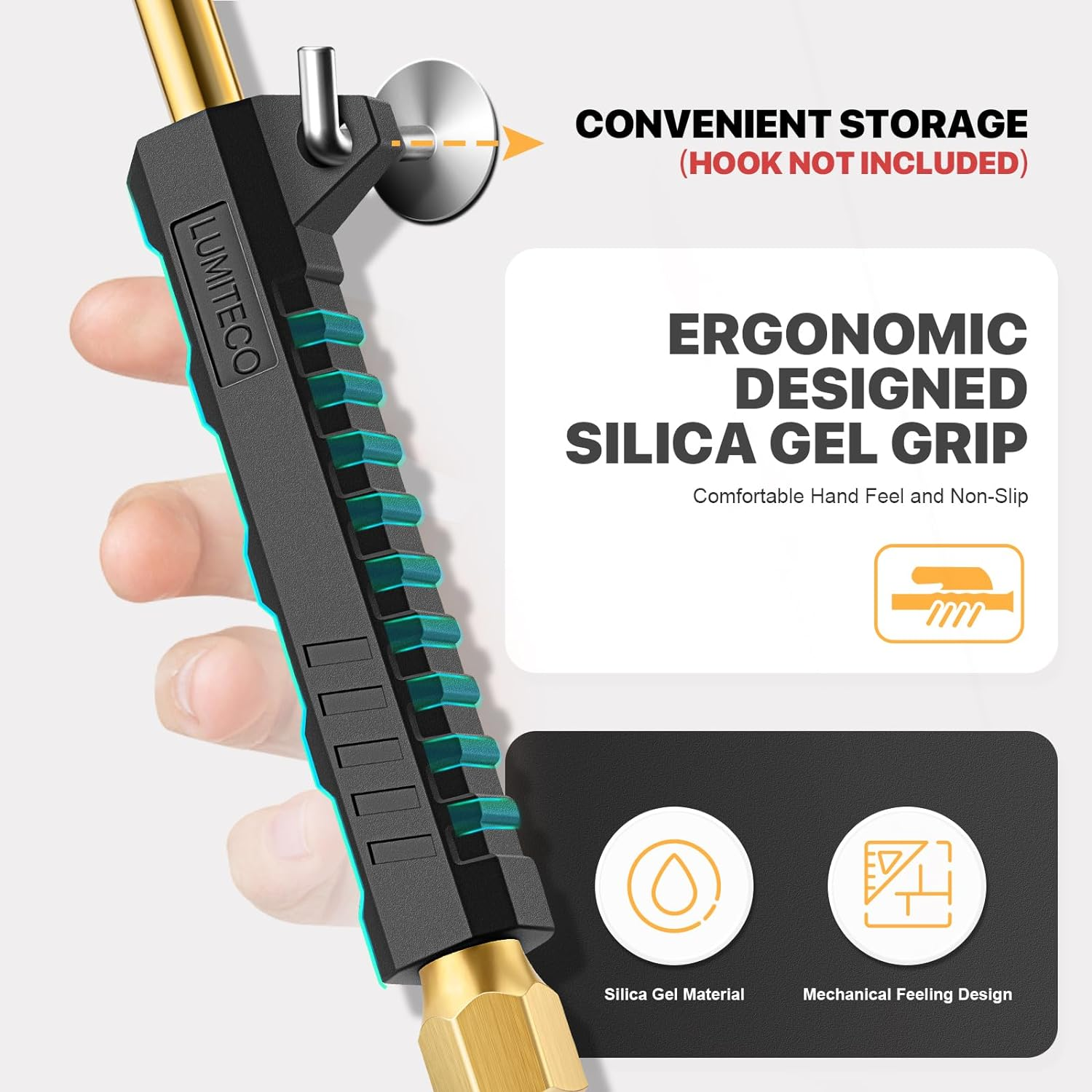 [12'' EXTENDED REACH DUAL HEAD AIR CHUCK] 12" lengthened air rod along with quality dual air chuck head, especially designed for truck, RV, bus' dual wheels and hard-to-reach tire valves. Straight foot air chuck for inner tires or hard-to reach wheels and 30° reverse chuck better for outer wheels. [SOLID BRASS MADE & ERGONOMIC DESIGNED RUBBER GRIP] LUMITECO tire air chuck is constructed with high quality brass body and a zinc alloy air nozzle, and the standard quick plug is also made with solid brass. An ergonomic mechanical designed rubber grip provide comfortable hand feel and non-slip inflating operation. Definitely a perfect choice no matter for business or household use, will serve you faithfully for years. [CLOSED FLOW & INNER THREAD HAND FREE DESIGN] Both air chuck ends with lock on valve core threads, push it on tire valve stems firmly and lean it slightly to ensure no air leakage, when inflating finished, align it back straight to valve stem and pull it off. This closed-flow air chuck only allows air flow when engaged to the valve cores while shut off air flow when take it off valve cores. All these bring you an easy one-hand inflating operation. [MULTIPLE WAYS EASY CONNECTION] This premium air chuck featured a 1/4" FNPT thread for easily connected to most air compressor's air lines or tire inflator gauge. Also including a standard 1/4" male quick plug, for conveniently and swiftly connecting to air lines female quick couple. This air chuck not only for dual wheels also ideal for conveniently inflating other tires with schrader valve, such as bikes, motorcycle, car, etc. [YOU WILL RECEIVE] Includes 2 pcs straight foot air chuck with grip handle, 2 pcs standard 1/4" male quick plug, 1 pcs teflon tape. If you are looking for a durable air chuck set, this one is for you. Just buy with confidence today, we always stand behind all of our items! Product Description