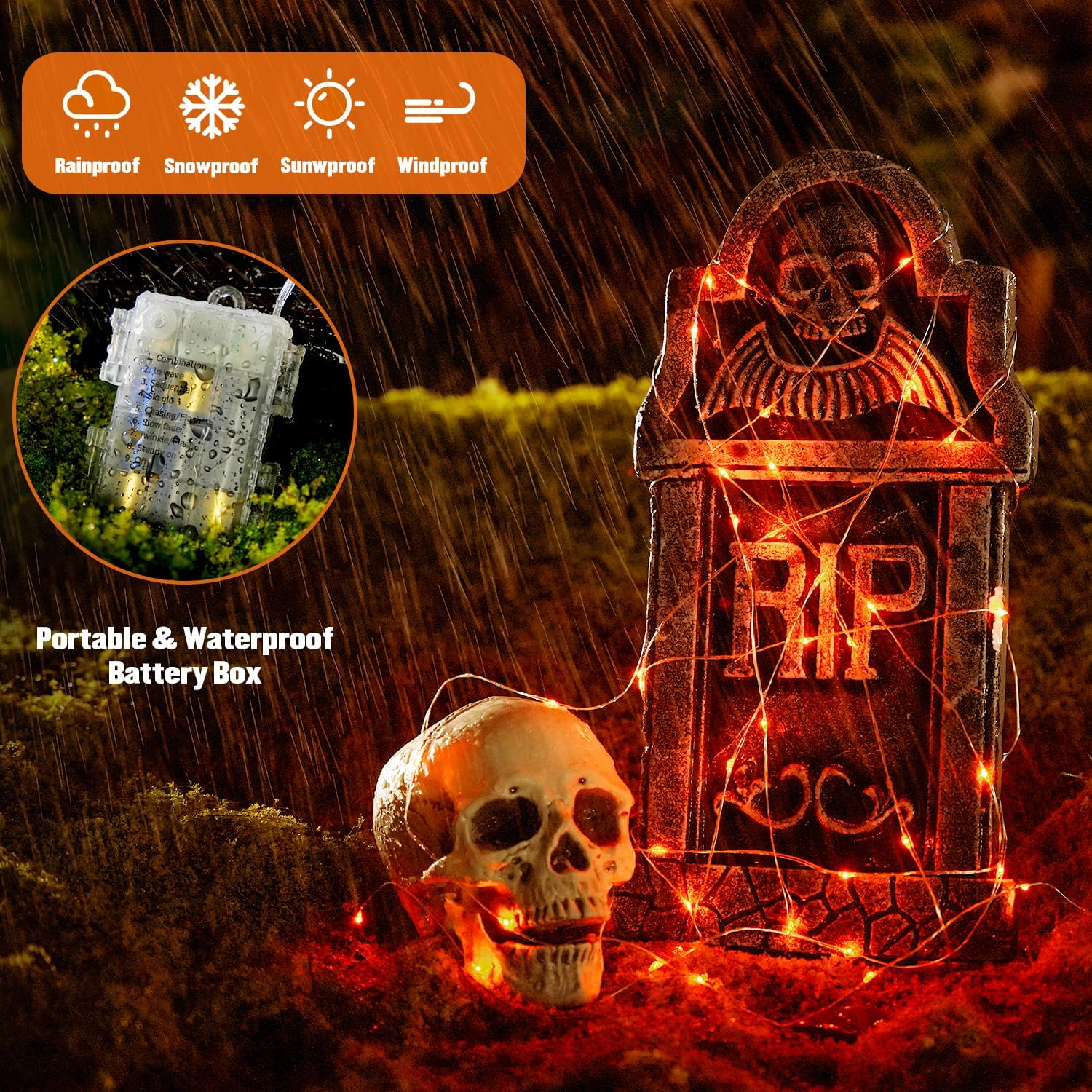2 PACK AND SUPER BRIGHT HALLOWEEN FAIRY LIGHTS - 100 delicate LEDs are inlaid on 33ft of premium copper wire, which emit very bright orange fairy light with a steady 360-degree viewing angle. The orange Halloween lights are absolutely wonderful for adding a sense of ambiance. DIY ORANGE STRING LIGHTS - Orange Halloween string lights are bendable and can be easily wrapped. On Halloween, the orange lights can be wrapped around wreaths, furniture, fireplace, craft, bedroom, fence, window, dimly lit place, or any corner of your room. It not only adds a festive atmosphere but also guides people to avoid falling! Come to the exciting DIY home decoration with the orange Halloween lights! 8 MODES & REMOTE CONTROL TWINKLE LIGHTS - 8 lighting settings to meet your needs for decorating different scenes, adding a distinctive atmosphere. Be it for a horrible Halloween, or a Joyous Christmas, these orange fairy lights will do the trick! The remote also has the function of timer and brightness adjustment, making the operation convenient. If you wrapped around the lights in a high place, such as a window or porch, the remote is a good helper! IP44 WATERPROOF AND PORTABLE FAIRY LIGHTS - Stop worrying about outdoor Halloween decorations on rainy days, The Halloween lights battery operated are totally Splash-proof, Rainproof with IP44 certification. The battery holder can resist gentle water spray and splash. You can arrange them indoors and outdoors as you like. NOTE: the battery holder cannot be partially or fully submerged. SINCERE SERVICE - If you have any questions about our orange fairy lights, you can contact us directly. You will not suffer any loss in product quality. Your satisfaction is our unremitting pursuit. Product Description Waterproof Orange Halloween Lights, A Must Have for Spooky Halloween Outdoor Indoor Decoration! Intelligent Remote Control, Control at Will Timer: When the light is on, press this "timer" button, the fairy light will blink once, which means the timer starts to take effect. 6H ON/18H OFF, will be turned on for 6 hours and off 18 hours automatically cycle. 8 Modes: combination, in wave, sequential, slo glo, chasing/flash, slow fade, twinkle/flash, and steady on. 10 brightness level: press the "+" and"-" to adjust the brightness. Waterproof Battery Box, Perfect for Indoor and Outdoor Use Waterproof Rubber: Don't remove the waterproof rubber of the battery case, or it will not be waterproof. Waterproof Rate: Both orange Halloween lights outdoor and the battery pack are IP44 waterproof . Type of battery: 3 * AA battery (Not included) There is a button on the battery box that can control 8 functions. Come in and DIY Your Spooky Halloween with Halloween Fairy Lights! After Halloween carnival, does it feel like there is no use for orange Halloween lights? No, it can also be used as a daily decoration, continue to decorate your life, increase the atmosphere of the home, give children a wonderful atmosphere. These orange Halloween fairy lights are battery powered and durable, you can use them with confidence. Pay Attention: The orange Halloween lights need 3 * AA battery, and IT'S NOT INCLUDED. You will get 2 pack each 33ft 100 led orange Halloween lights. Specifications: Wire Color: Silver Wire Lights Color : Orange Copper Length: 1000cm / 33ft Power Supply: Battery Powered Daily Decoration with Orange Fairy Lights Halloween Lights Battery Operated