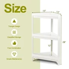 2 Pack 3-Tier Bathroom Shower Gel Detachable Floor Corner Shelf w/ Drainage Hole Key Features ● Corner Design for Saving Space: With 90 degrees triangle design and the compact size of 13" x 13" x 28", the corner shelf can fit snugly into the wall to make full use of the space. Plus, the triangle organizer rack is detachable and perfect for any corner around the room. ● 3-Tier Storage Shelf with Raised Edge: Each shelf spaces approximately 12" apart to provide classified storage space for kinds of daily supplies, such as shampoo, toiletries, towels, spice bottles, and food, etc. Additionally, the raised edge prevents the items from falling down. ● Lightweight yet Reliable Structure: Made of selected PP, the triangle storage rack is sturdy and durable for long-lasting use. Each shelf is tightly connected to the rods while stable support legs account for reliable structure. Weighs only 4.5 lbs, and the floor corner shelf is easy to carry around. ● Waterproof Design: The closely spaced drainage holes on each shelf are designed to avoid water accumulation and promote airflow. More, the hollow-carved design makes it easy to adapt to the humid environment of the bathroom or shower, thus extending the life of the corner stand. ● Easy Assembly and Free Combination: It only takes 4 steps to finish assembly process. Can not only this set serve to be a 3-tier + 3-tier corner shelf in your bathroom, kitchen, or living room, but also be used as a 2-tier + 4-tier storage organizer on the countertop or under the sink. Overview -90 degrees triangular shape is easy to fit snugly into the wall -Used as a 3-tier + 3-tier or 2-tier + 4-tier corner shelf based on your needs -The detachable corner shelf can be put under the sink or on the countertop -3-tier corner shelf set of 2 keep your room free of clutter -Sturdy and durable plastic storage rack for long-lasting use -The closely spaced drainage holes allow for quick drain -Raised edge prevents items from falling down -Smooth and round corner highly improves safety -Ideal for bathroom, living room, laundry room, kitchen, etc -Comes with smooth surface for simple maintenance -The bathtub shower shelf is easy to install and move Color White Material PP Overall Dimension 13" x 13" x 28" Height Between Shelf 12" Clearance from Shelf to Ground 2" Net Weight 4.5 lbs Weight Capacity of Each Shelf 22 lbs