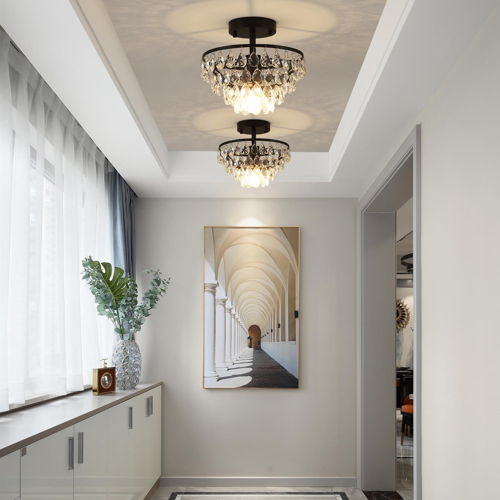 Elevate your space with the captivating allure of these lampara de techo. This 2-pack black chandeliers for dining room offers a stunning addition to any room, casting a warm and inviting glow that instantly transforms the ambiance. Meticulously crafted with precision and attention to detail, each black flush mount ceiling light features a cascade of glistening crystals that catch and refract light, creating a mesmerizing display. Whether adorning your entryway, dining room, or living area, these mini chandelier exude timeless elegance and sophistication. With their versatile design, they seamlessly complement a variety of decor styles, from traditional to contemporary. Experience the magic of illumination and elevate your surroundings with these breathtaking Black Crystal Chandeliers. Enchanting Raindrop Design: The sparkling raindrop crystals gives this modern crystal chandelier a unique, modern style. This black chandelier combines modern aesthetics with timeless elegance, turning any space into a masterpiece of ambient lighting E26 Bulb Base: These 2 pack black crystal chandelier features a E26 standard socket, compatible with various bulb types up to 60W. It's also compatible with dimmable bulbs and dimmers (not included). Ideal for those who love flexibility in lighting Easy Installation & Extra Crystals: Installing this crystal ceiling light fixture is a breeze with its compact size (9.84"L x 9.84"W x 9.06"H) and 5 spare crystals included. It's a practical and stylish choice for your dining area, bedroom, or living room Stunning Durability: Crafted with a robust metal frame and adorned with premium K9 raindrop crystals, this small chandelier promises long-lasting beauty. The black finish resists rust and fading, making it an elegant yet sturdy addition to your home Artistic & Functional: The dazzling crystals of this black ceiling light will sparkle whether the light is on or off. It's elegant appearance complements various rooms, such as dining room, bedroom, kitchen, foyer, hallway, entryway, or living room, etc