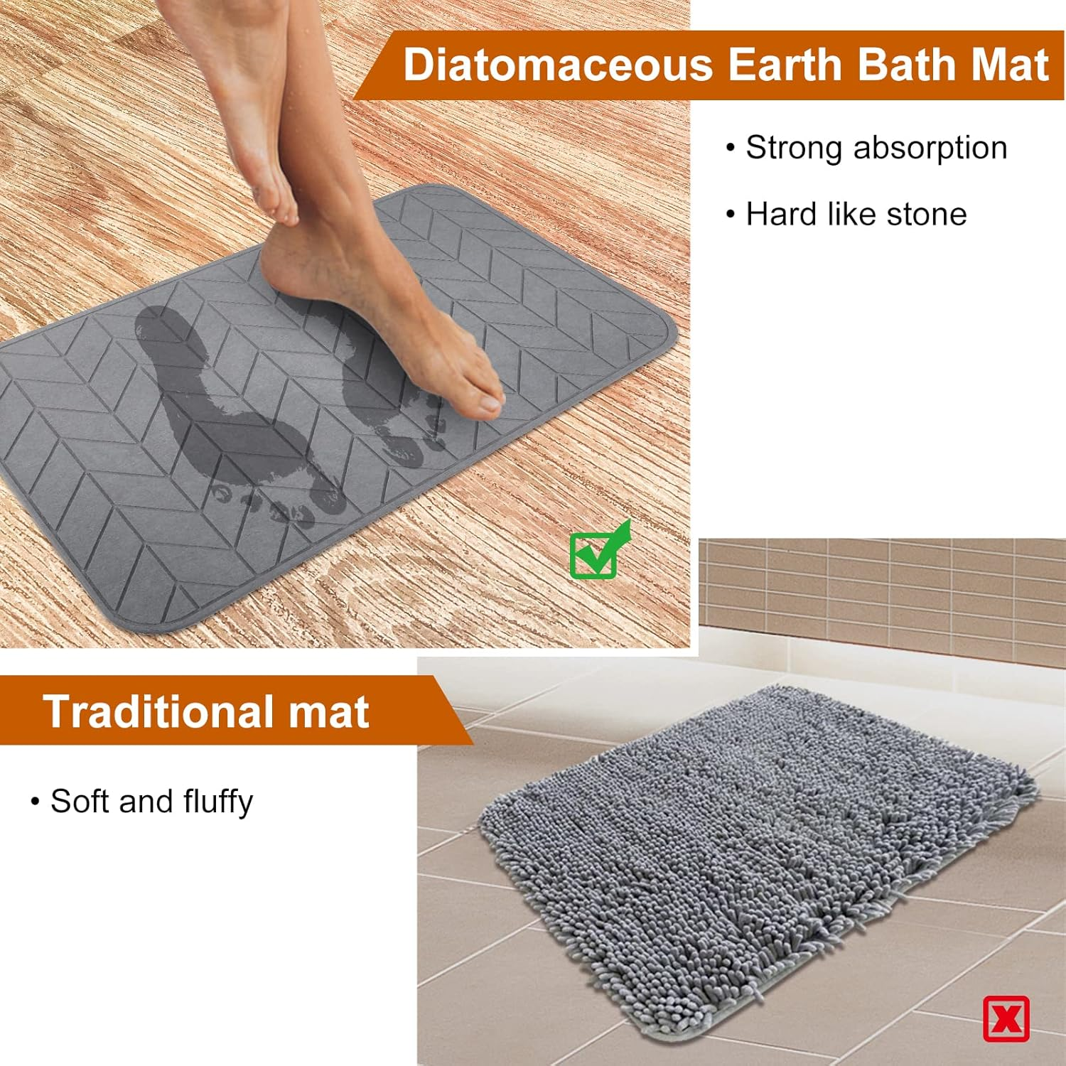 Store New Arrivals Add to Favorite View Feedback Contact Fast deliveries to the customer's home Quality customer service John Make the customers happy! 2 Pack Diatomaceous Earth Shower Mat, Stone Bath Mat, Nonslip Super Absorbent Fast-Drying Hard Bath Mat for Bathroom Shower Floor, 24 X 16 Inch, Grey Arrow Design Description 1.Please Note: this bath stone mat is Hard and Sleek, is not soft and fluffy, not like typical soft rug.You will be like stepping on a sturdy earth plate and a cool slate like STONE. 2.Strong Absorption&Quick Drying: Unlike traditional cotton and fabric bath mats, this Diatomite Earth Mat made up of all natural micro pores, can quickly soak up water, and gets dry in a few minutes, keeps your floor dry and clean. Stylish Japanese design that can be used as a home decor. 3.What You Get- 2PCS hard foot mats, with a rubber Anti-Slip Mat and sand paper. Size: 23.62 x 15.35 inch.For long-time use, please put the mat in a well-ventilated place to air dry regular. 4. Anti-Slip:Put the Rubber Anti-Slip Mat under this mat to prevent skidding. 5. Easy to Clean - Compared to traditional bath mat, no daily washing needed. When it get stains, just wash it with running water or wipe with a wet cloth, or use sandpaper gently grinding the surface when necessary, then air dry. Our Diatomaceous Earth bath mat will quickly refresh itself with excellent absorbent performance. 6. If the product is damaged, just contact us for free replacement Notice 1. The floor mat is made of diatom mud, it is hard rather than soft. Since this diatomite bath mat is hard, please avoid hitting the mat when you step on it. 2.If you feel micronized powders on the surface, it is not a quality issue but a normal phenomenon of the productive process. You can use damp cloth and lightly rub away. 3.Please put the mat in a well-ventilated place to air dry and do not expose it directly under sunlight for a long time. 4.Do not use detergents containing surfactants and dip into water. 5.Do not step on this bath mat with your shoes, otherwise the stains will be sucked. 6.Do not use on the uneven ground or soft ground and also not on the sharp object. Item model number 1 Color Dark Grey Product Dimensions 24"L x 16"W Material Stone Bath Mat Item Weight 9.53 pounds Shape Square Size 24" x 16" (Square) ABOUT US We offer the best prices around on high quality products. Our E-store includes media such as books, movies, music and games while offering electronics, toys, sporting apparel, clothing, tools, general home, garden items and more. SHIPPING We are always working hard to ensure your package arrives as soon as possible. Please understand that some factors like weather, high postal traffic, and the performance of shipping companies are outside of our control. We offer free shipping to the lower 48 states and ship within 2 business days of payment, usually sooner. We do not accept P.O. Boxes. Please provide a physical address. For shipping outside of the continental USA, we only use eBay's Global Shipping Program. The item is shipped to KY and then sent to the rest of the world. International customers are responsible for all duties and taxes. Continue to 'check out' to calculate costs for shipping the item to your country. Messages regarding eBay's Global Shipping Program MUST be directed at eBay EXCLUSIVELY. RETURNS We offer a 30-Day Return Policy on items in which you are not completely satisfied with. You have the option of a full-refund or an exchange of the item. No returns are available on items shipped outside of the USA PAYMENT We accept PayPal. CONTACT US This page content is yet to come Please ad us to your favorite seller and visit again later Thank You CUSTOMER SATISFACTION We try our very best to make sure every customer is completely satisfied. If there's a problem, message us! We're happy to help. WE ACCEPT