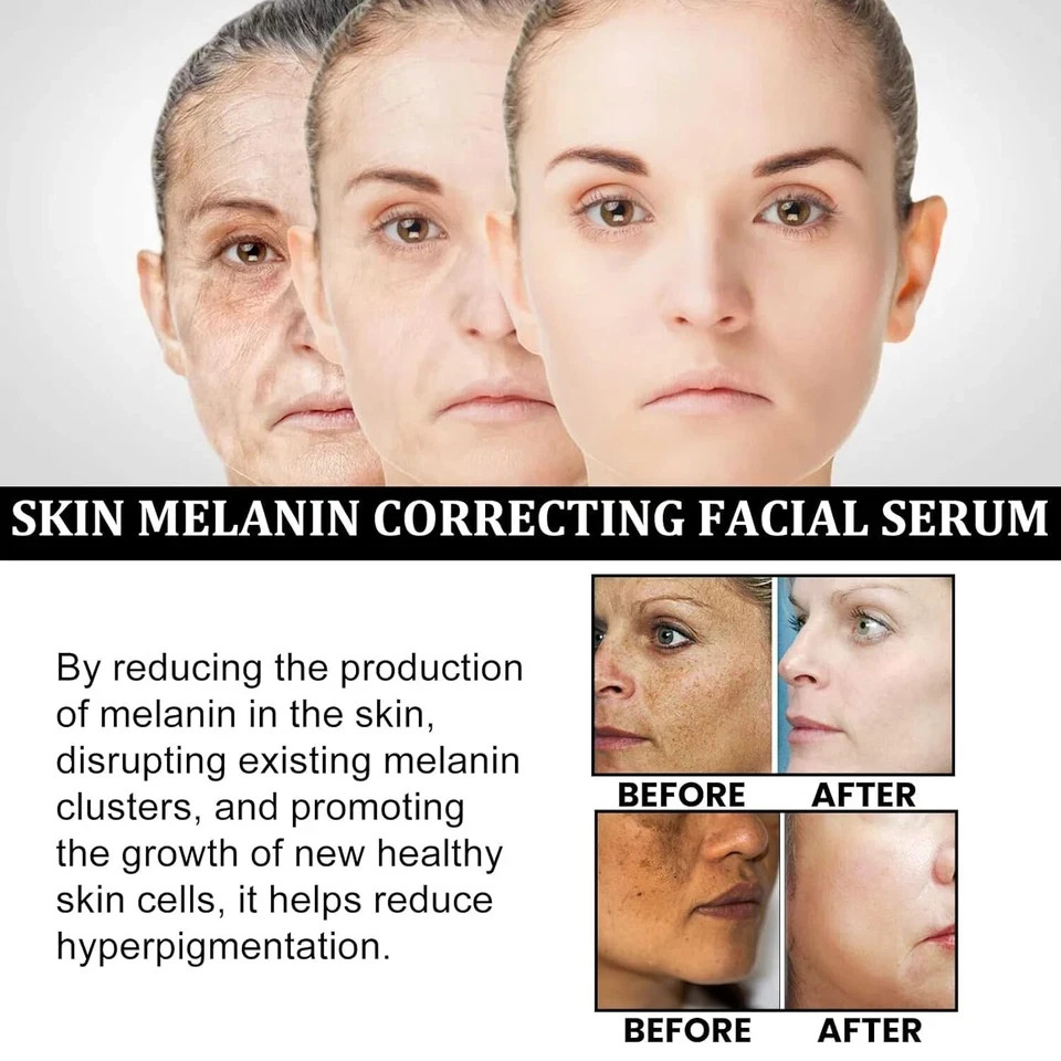 2 Pack Melanin Correcting Facial Serum, Dark Spot Corrector Daily Face Whitening About this item: 【Melanin Correcting Face Serum】Melanin Correcting Facial Serum for face with helps boost collagen production and reduce fine lines and wrinkles. 【Hydrates and Moisturizes】Our serum draws in moisture to increase skin's moisture content, plumping and improving its overall appearance. It absorbs quickly, is non-greasy, non-sticky, and won't clog pores. 【Suitable for all Skin】This serum is suitable for both men and women, whether you have normal, dry or combination skin, it will give you good results, trust me, this is your best choice. 【Easy to Carry and Use】It is easy to carry and use will not cause too much burden on you, you can use it anywhere. 【How to Use】1. Wash and dry your face. 2. Take 3 drops on clean palms, massage face and neck with fingertips until fully absorbed. 3. Follow up with your favorite moisturizer. Repeat morning and night.