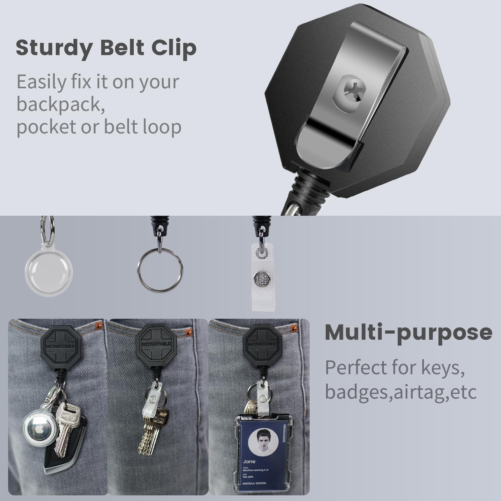 This retractable keychain combo is a game-changer! The heavy-duty steel cord and clip keep my keys secure while the smooth retraction works flawlessly. Love the detachable AirTag holder—perfect for tracking essentials. The extended reach is super handy, and the build feels solid after weeks of use. No more fumbling for keys—it’s sturdy, functional, and totally worth it!