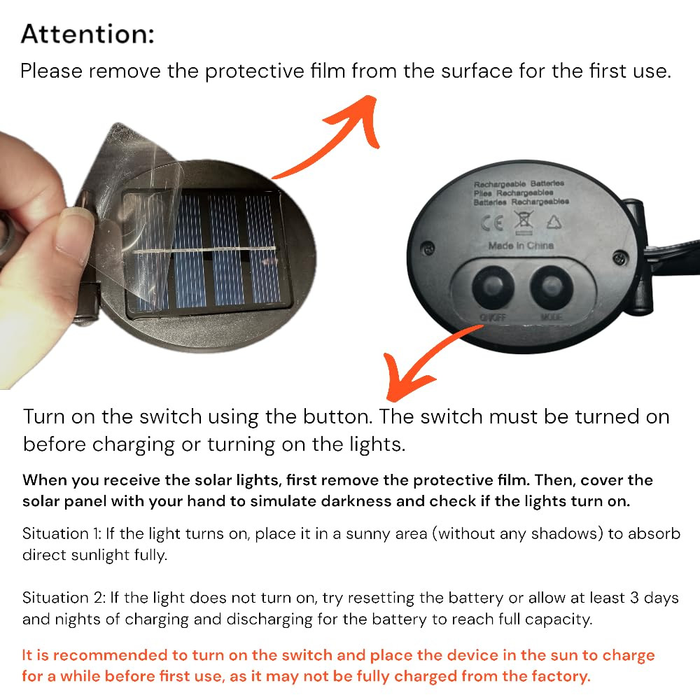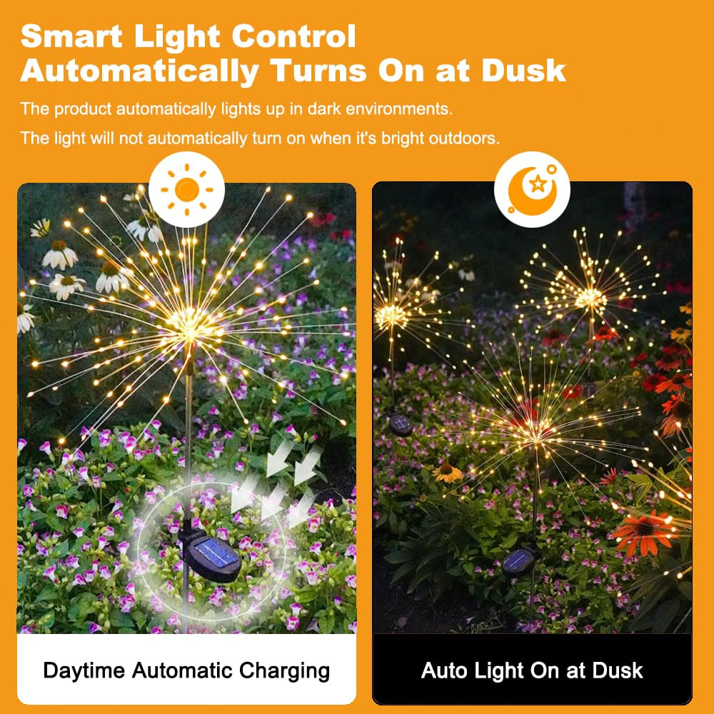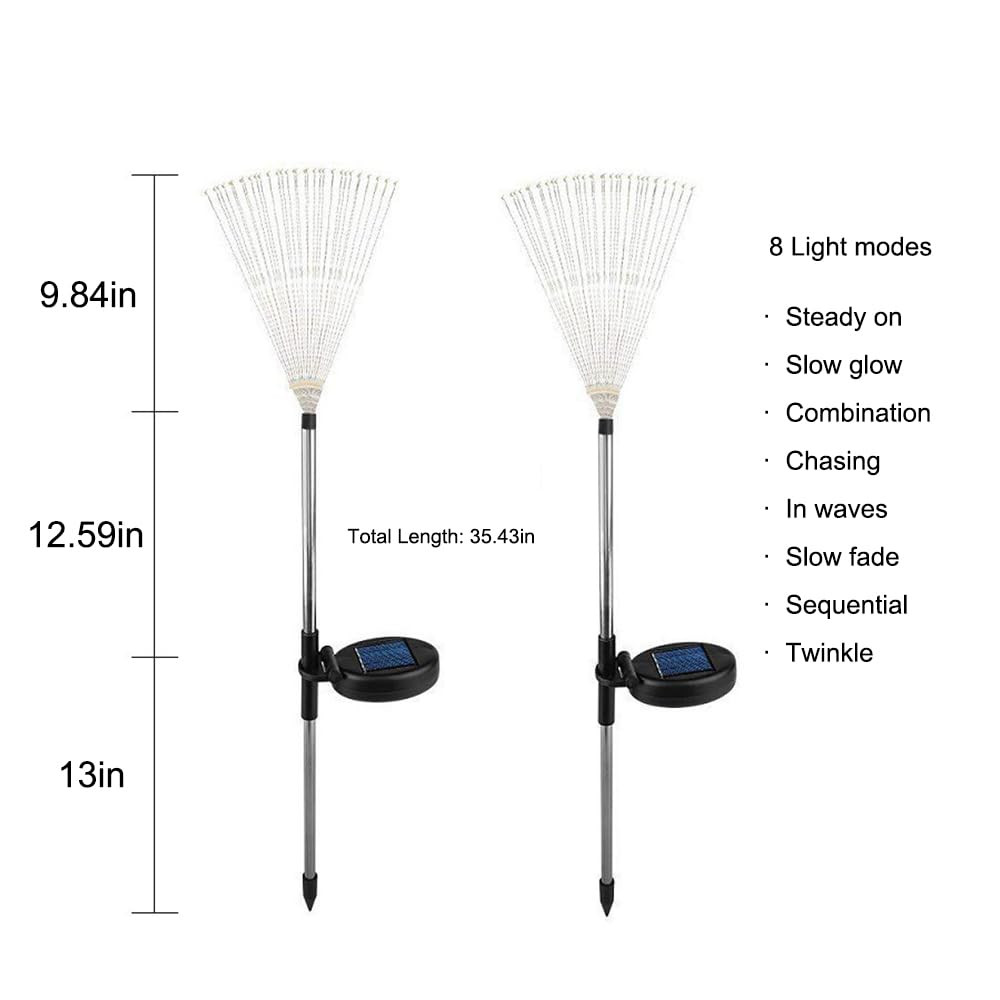 【Solar Firework Lights: 8 Modes, 150 LED Starburst】Each pack contains 2 lights with eight easily operated modes via a button. These solar-powered firework lights feature a dazzling starburst design with 150 energy-efficient LED lights, creating a captivating and radiant display. Decorate your playhouse, balcony, patio, or planters as you like. It is an ideal choice with high quality and durability. 【Effortless Installation & DIY Any Shape】 Simply stake the light into the ground and let the solar panel charge during the day for automatic illumination at night. Made of flexible copper wire and bright LED beads, these lights allow you to DIY any shape you desire. Whether it's a starburst, flower, heart, spiral, or spherical design, the possibilities are endless. These lights are perfect for gardening enthusiasts and make great decorations for various holidays such as Halloween, Christmas, Thanksgiving, and New Year's Day. 【Long Working Hours】Equipped with 150 durable low-heat LED lights and an upgraded solar panel (2V 250mAh), these lights feature a built-in 1.2V/600mAh high-capacity AA battery. They charge for 6-8 hours under standard sunlight during the day and provide 10-12 hours of illumination at night when fully charged. 【Waterproof Solar Lights Outdoor】 These lights are IP65 waterproof, making them suitable for outdoor use and able to withstand any bad weather. They are corrosion-resistant and highly transparent, featuring sturdy aluminum poles and premium waterproof capabilities to ensure they continue to charge normally even after exposure to wind and rain. 【Note】 When you receive the solar lights, please remove the insulation strip from the solar panel. Cover the solar panel with your hand to simulate darkness and check if the lights turn on. If the lights illuminate, place them in a sunny area without any shadows to absorb full direct sunlight. If the lights do not turn on, please reset the battery or allow at least 3 days and nights of charging and discharging for the battery to reach its full capacity. If you have any questions about the solar lights, please contact us and we will resolve the issue as soon as possible.