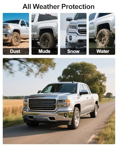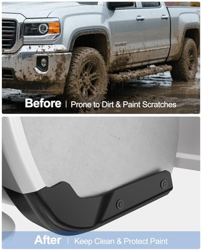 2 Pack Truck Mud Flaps Compatible with 2019–25 Chevy Silverado 1500 Front & Rear 2 Pack Truck Mud Flaps Compatible with 2019–25 Chevy Silverado 1500 Front & Rear Complete 6-piece splash guard kit (2 front, 4 rear) for total protection against mud, rocks, and grime with a rugged, high-clearance design. Precisely designed for GMC Sierra 1500 (2019-2025), offering seamless fitment and a stylish upgrade; not compatible with AT4X/AEV models. Made from durable, military-grade ABS material resistant to cracks, warps, and UV fading, ensuring long-lasting protection on tough roads. Easy, drill-free installation by snapping into place, allowing quick replacement of OEM fenders without tools. Tool-free disassembly with a fender remover, enabling effortless reversion to factory look whenever desired.
