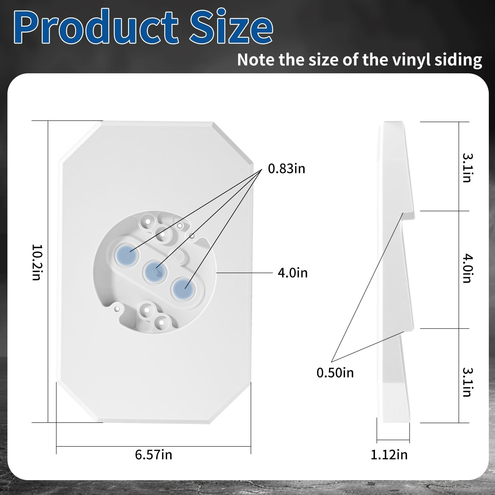 2 Pack Vinyl Siding Mounting Blocks, 8141DBL Vinyl Siding Light Mounting Block with Built-in Electrical Box, Outdoor Mounting Plate kit for 1/2 inch Double Product Details Material: plastic Brand: ZIYIZE Color: White Shape: Rectangular Item Thickness: 0.5 Inches Package Dimensions : 10.98 x 7.17 x 2.76 inches; 1.43 Pounds Date First Available : July 11, 2025 Manufacturer : ZIYIZE Best Sellers Rank: #109,094 in Tools & Home Improvement (See Top 100 in Tools & Home Improvement) #55 in Siding Building Material #55 in Siding Building Material Customer Reviews: 4.5 4.5 out of 5 stars 2 ratings Perfect Size: This siding mounting block is specifically designed for 1/2'' lap siding with a 4-inch overlap, ensuring a snug fit Durable Materials: Our vinyl siding mounting block is made of high-quality UV resistant plastic, providing a solid feel. The vinyl siding light block is white, and the surface can be painted to match the color of your vinyl siding or lighting. You can DIY for yourself Easy to Install: This siding mounting kit with built-in electrical box is super easy and quick to install on Vinyl siding. 1.Drill the hole through the siding lap to put a wire through the hole outside. 2. Remove the knock out object from the electrical box and insert the cable connector into the hole. 3. Thread the wires through the cable connector and install the box using the included connector. 4. Place the external light on the electrical box Widely Applications: The siding mounting kit can mount light fixtures on all siding types, including T-111, HardiePlank Lap Siding, and other flat surfaces. It makes adding new lighting to existing siding more easy with the built in electrical box. Note:Only fit for 4 inch height of the Vinyl Siding with double 1/2 inch width lap siding surface Package Contains: You will receive 2 sets of Vinyl Siding mounting Blocks with Electrical Box, Cable Connectors, and Screws for complete installation. NOTE: If the size of the mounting block does not match your siding surface, caulk around the top of the siding mounting kit Vinyl Siding Mounting Blocks 2pack-white