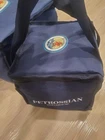 Elevate your picnic or travel experience with this set of two authentic Petrossian cooler bags. This lot includes both a large and a small insulated tote, perfect for keeping your food and beverages, especially caviar, at the ideal temperature. Both bags are a sleek navy blue color and feature the distinctive Petrossian logo, showing a man with a harpoon on a raft. The large tote is ideal for a full picnic or to carry multiple items, while the smaller bag is perfect for a quick lunch or for transporting a single item, such as a tin of caviar. These bags are not only functional but also a stylish piece of food and beverage memorabilia. Features: Set includes a large and a small cooler bag Insulated lining to keep contents cool Zipper closures on both bags for secure transport Durable material, ideal for picnics, beach trips, or daily use Distinctive Petrossian logo on the front of each bag Condition: Pre-owned, but in excellent condition with no signs of wear. They both look like they've never been used. Please see photos for a closer look at the item's condition. Dimensions (Approximate): Large Bag: 8" high. 14"x14. Small Bag : 8" high. 8"x8". These bags are a great find for any fan of Petrossian products or luxury brand collectors.