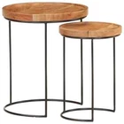 This classic wooden coffee table set exudes a vintage charm and will make a timeless addition to your home. These coffee tables are made of acacia wood which is solid and stable. The frames are made of steel, adding to the tables' sturdiness. The beautiful wood grains make every piece of furniture unique and slightly different from the next. This wooden table set features 2 tabletops, which are perfect for placing food, drinks and other essentials within reach. Note: Colors and grains may vary from piece to piece, making each of the coffee tables unique. The delivery is random, ensuring the exclusivity and individuality of your product. color: Brown and black Material: Solid acacia wood with a natural finish, powder-coated steel Dimensions (large table): 14.1" x 16.5" (Diameter x H) Dimensions (small table): 10.2" x 14.6" (Diameter x H) Assembly required: No Delivery contains: 2 x Coffee table Shipping Restrictions Due to the limited access of our couriers, this item cannot be delivered to the following locations: Alaska Federated States of Micronesia Guam Hawaii Marshall Islands Military Posts (APO / FPO) Palau Puerto Rico US PO BOX Virgin Islands Our customer support will contact buyers for orders with no shipment service, and these orders will be cancelled and fully refunded afterwards.