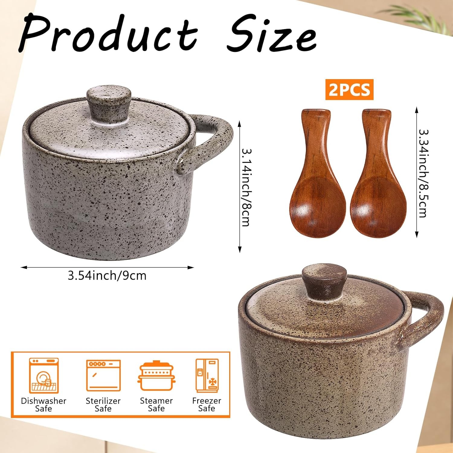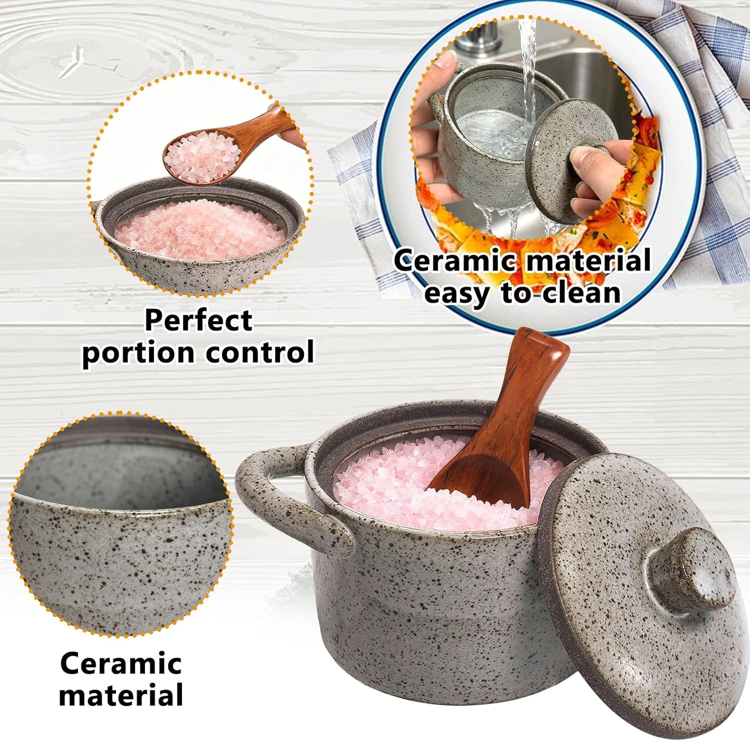 About this item Package Includes: You will receive two salt cellars with lids and wooden spoons. The salt cellars measure 3.54 x 3.14 inches (9 x 8 cm), and the spoons measure 3.35 x 1.42 inches (8.5 x 3.6 cm). These generously sized salt cellars are easily placed on any countertop, making them ideal for individual meals or small family gatherings. High-quality Materials: This speckled ceramic salt cellar is made of high-quality ceramic, which is durable and has a heavy texture. Its sturdy construction ensures it can withstand daily wear and tear, making it a reliable choice for storing spices. Unique Design: This rustic farmhouse spice jar blends vintage inspiration with country farmhouse style to enhance the beauty of your kitchen. Its lid design is dust- and moisture-proof while being both practical and decorative, adding a rustic vintage touch to your kitchen. Easy to Use: This heavyweight kitchen canister comes with a special wooden spoon, which makes it easier to use. The jar body is designed to be stable and not easy to tip over, making it easy to add and store. In addition, it is dishwasher-safe, saving time and effort while combining modern convenience. Wide Range of Uses:This pottery cooking dish can be used for direct cooking, as well as for storing seasonings such as salt and pepper. It can also decorate the kitchen or dining area. It combines cooking, storage and decoration functions in one, making it a must-have for chefs and families. Material: Ceramic Color: Multicolor Brand: Item Weight: 1.5 Pounds Shape: Round