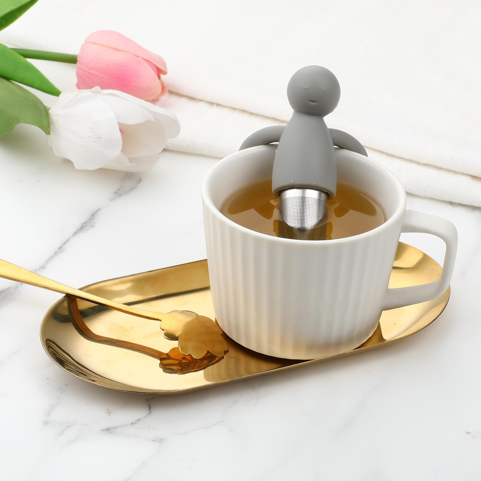 Product name: 2pcs tea diffusers for loose tea Product color: grayblue Product material: silicone Product size: Stainless steel mesh diameter 2cm/0.78in, length 6cm/2.36in, total length 11cm/4.33in Packing list: 2pcs loose tea infuser Cute Design: The tea strainers for loose tea feature a smiling human shape design. The arm can be hung on the teacup to fix the tea steeper. Interesting design and convenient operation will become an indispensable tea set in your life and work High-Quality Materials: The tea strainer is made of food-grade 304 stainless steel and silicone material, which is rust-proof and corrosion-resistant, reusable, healthy and environmentally friendly. Fine Mesh Tea Strainer: The loose leaf tea steeper is equipped with an ultra-fine mesh design that prevents loose tea leaves from escaping into your tea, providing a smooth and enjoyable tea drinking experience. Easy to Use & Clean: The tea steeper for loose tea is designed with convenience in mind, just twist the top to open and close, making it easy to load and remove tea leaves; easy to clean, just rinse under running water or dishwasher clean. Widely Used: Featuring ultra-fine mesh and flexible silicone arms that easily fit different sized cups, the loose leaf tea infuser is perfect for brewing tea with a variety of loose tea leaves. Also a perfect gift for family, friends and colleagues