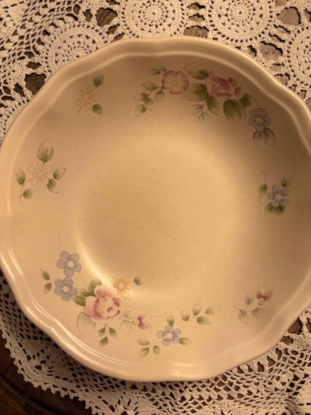 The Tea Rose Individual Pasta Bowl by Pfaltzgraff is a vintage original ceramic serving bowl with a pink floral Tea Rose pattern. This 8" bowl is perfect for serving pasta or other dishes, adding a touch of elegance to your table setting. Made with quality materials, this bowl is a charming addition to any kitchen or dining collection.