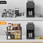 Spice Rack Organizer Shelf For Kitchen Counter, 2 Tiers Countertop Coffee Station Organizer,Wooden Coffee Bar Accessories,Space Saving Counter Shelf For Bathroom, Desk Shelf Organizer Multifunctional Countertop Organizer:2 tier counter shelf rack can be used in different places,such as living room, bathroom, bar counter, kitchen, and office desktop. Wooden desk shelf can organize coffee accessories, tea bags, snacks, office supplies, makeup,spice jars,and small plants etc. Sturdy Design:Coffee bar organizer shelf is combined with metal frame and thick board ensuring durability, the X design on the sides enhance the stability. Kitchen counter shelf has a back rail so it doesn't have to be placed against a wall to keep things from falling off the back. We also provide S-hooks to add more storing space. Large Capacity Counter Shelf:Coffee station organizer designed in two-tier maximizes space utilization while keeping everything easily accessible. Two size shelf riser are available: Medium (13.2''L*7.6''W*13.7''H) and Large(15.8''L*7.6''W*13.7''H) choosed according to your space. Ideal Gift Choice:With this 2-tier counter shelf for kitchen, everything lined up perfectly and Say goodbye to the chaos countertop! So this coffee bar organizer is a perfect gift to yourself and but also to your friends and parents. Be it a housewarming, Thanksgiving day, Christmas, birthday party, or special occasion. Easy To Assemble:Place the boards onto the iron frames and use screws to fasten them securely. Spice rack shelf installation tips:not to tighten down the screws until you have the lateral shelves in place otherwise it won't be square.