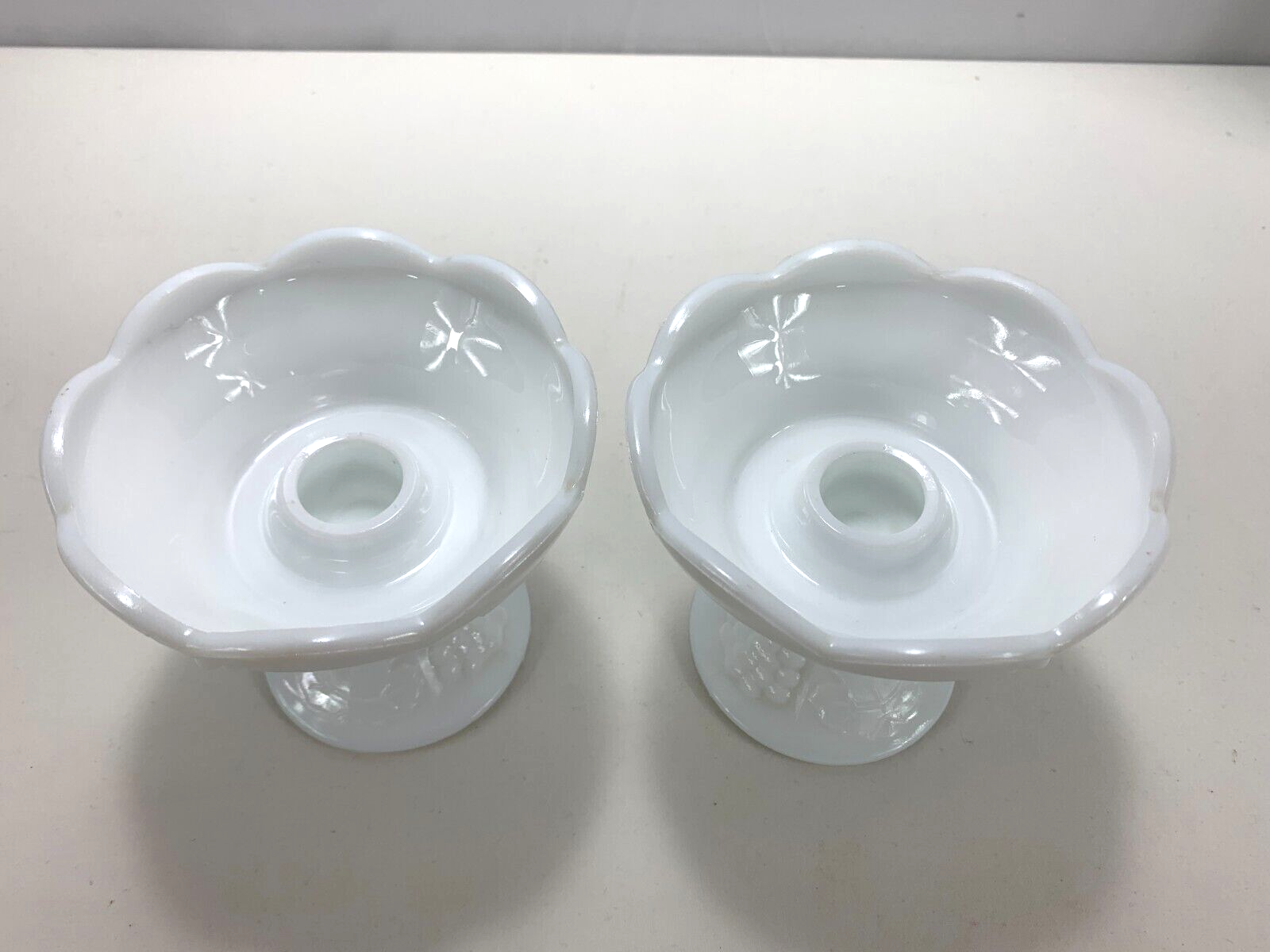 Set of 2 Vintage Indiana Colony White Milk Glass Harvest Grape Candle Holders Very Good Condition Height: 4" Tall Diameter: 4 1/2" at Top Will be well packed for shipment Thanks for looking!