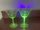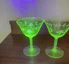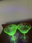 This product is a set of 2 vintage green uranium depression glass wine champagne stems. These etched wine glasses are made of glass and are perfect for serving wine or champagne in style. The brand is vintage, adding a touch of nostalgia to your table setting. The set includes 2 wine glasses, making it ideal for a small gathering or special occasion. The green color adds a unique and elegant touch to your glassware collection.