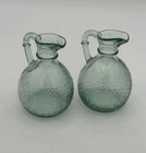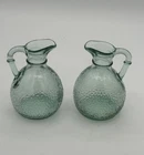 This vintage set of two mini glass cruets is a delightful addition to any collection. The intricate raised design and retro style make them a unique and charming item. They are made of green pressed glass with a bubble pattern and stand at 4-5 inches tall. The antique cruets are perfect for serving syrup or other liquids in a stylish and nostalgic way. Their petite size, measuring 3 inches in width, adds to their appeal. The brand is unknown, but the quality and craftsmanship are evident. Add these vintage treasures to your kitchen glassware collection today.