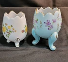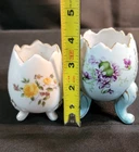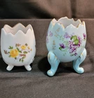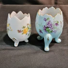 This product is a set of two vintage porcelain egg cups with a floral pattern. The egg cups are oval-shaped and have a cracked egg design. They are small in size and come in multicolor with gold trim. The set includes two cups, one blue with purple violets and the other white with yellow roses. The egg cups are three-footed and have a glossy finish. They were manufactured in Japan during the 1950s by the brand Inarco. The egg cups are an original and feature a romanticism style with a flower theme. They require hand washing only. No chips or cracks See Pictures for details
