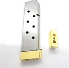 2 X 1911 Magazine Base Pads Magazine NOT INCLUDED, ONLY 1 BASE PLATE IS INCLUDED TO REPLACE STOCK PLASTIC BASE No modifications needed Material : Zinc Alloy Color: Gold Plated Product Description: Base Pad, Fits: Fits: All Kimber 1911 Kim Pro Tac-Mag Full Size 45 ACP 8-Round Base pads are only compatible with current production 47 Series magazines in .45 ACP caliber. Included: 2 X Magazine pads 4 X screws Listing and template services provided by inkFrog