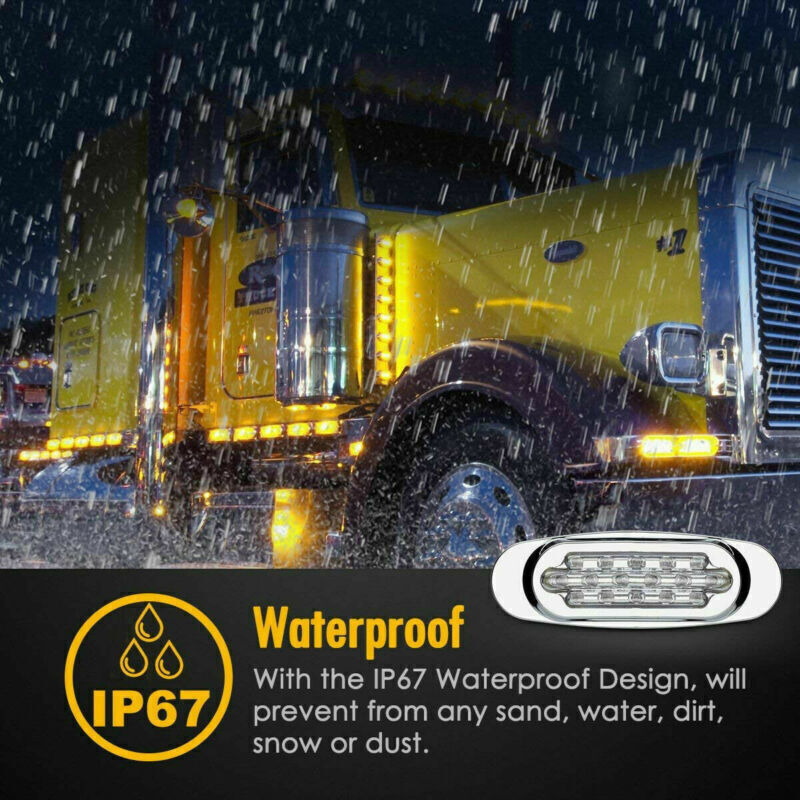 Product Description 20x 6.5"Amber LED Semi Truck Trailer Side Marker Clearance Lights w/Chrome Bezel Features: It comes with three wires and brings you high low brightness ( Dim Bright Function). Dim Functions as side marker light / Clearance Light / Running Light ; Bright Function as Turn Signal Light, stop turn tail light ,Cab Marker Panel Light etc. 16 high-flux LEDs consume less energy than incandescent lamps.Submersible, sonically-sealed lens and waterproof housing. Applications: universal esp. Semi Trucks / Freightliner / Peterbilt / Kenworth etc. truck trailers. Specifications: Light Color : Amber Includes : Pigtail Item : Clearance Marker Light Lens Design : Oval Dimensions: 16.4cm(6.5") x 5.5cm(2.15") x 2.2cm(0.8") Lamp Type : 16 LED Mounting : Surface Mount Power Source : 12V DC Wires: 3 wires Lifespan: Over 50000 Hours Functions as marker, clearance light, side marker, identification light, stop light, turn light, tail light and brake light. Applications: universal esp. Semi Trucks / Freightliner / Peterbilt / Kenworth etc truck trailers. Package Including: 20x 16LED marker lights