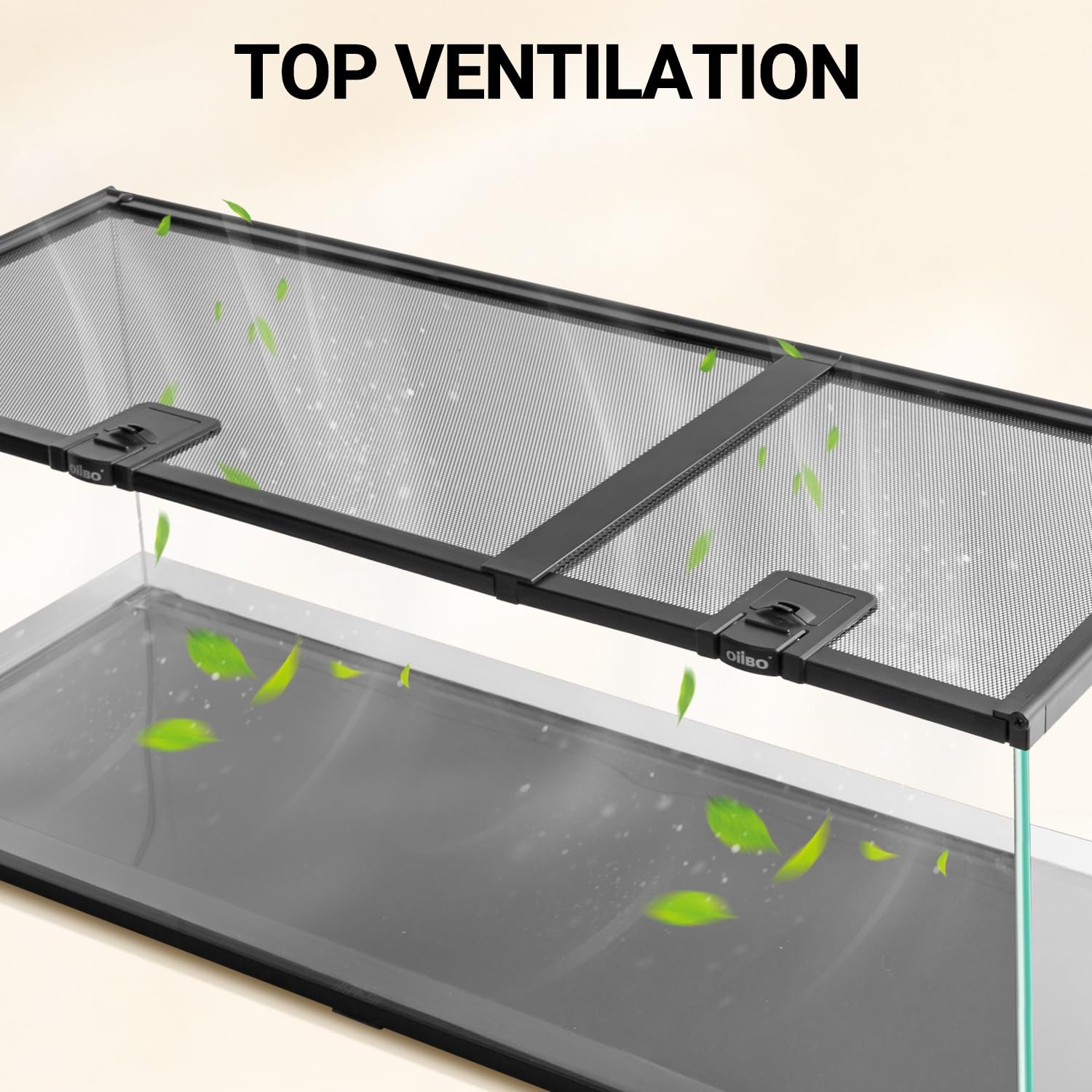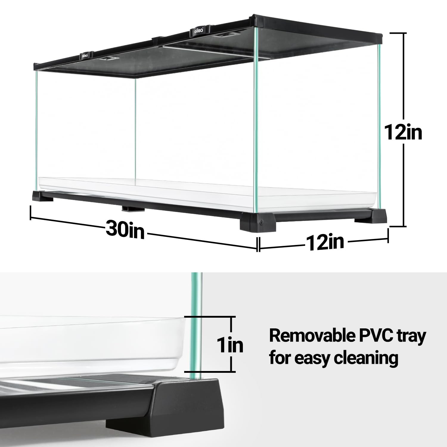 20 Gallon Reptile Tank, 30" x 12"x 12" Glass Terrarium Top Feeding & Dual Sliding Door Screen Ventilation with Easy Clean PVC Tray for Reptile Snake Hamster Small Animals 【Spacious & Secure】Size: 30" (W) x 12" (D) x 12" (H). The 20 gallon reptile cage offer ample room for your pet. Full view transparent glass, which is convenient observation and interaction. 【Top Opening Doors】Dual sliding doors for easy access, the top contains wire inlets for installing heating pads, heating cables, sensors, etc. 【Dual-Cover Design】Reptile terrarium boast has double screen covers, one side for daily opening, the other side for placing reptile lamp or other accessories. Metal mesh cover ensures adequate ventilation, allows full spectrum, UVB, and IR light penetration. 【Easy Feeding】The top of the cage includes specially designed feeding ports for easy feeding and to prevent escapes. 【PVC Tray】The knock-down reptile habitat comes with a transparent PVC tray for holding water and substrate, easily cleaning. Perfect for reptiles small animals pets as bearded dragon, lizard, snake, ball python, hamster, hedgehog, tortoise etc.