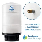 20 Gallon Pre-Pressurized Tank for Reverse Osmosis RO Systems with 14 gallons of Water Storage Capacity, 20, White The tank is made of quality materials (Tested by independent third-party to meet NSF and ANSI Standards) Include everything you need Shut-off valve, tank connector, and tank stand are included Flexible position The tank works efficiently in either vertical or horizontal position Peace of Mind Customer Service Register online to activate your manufacturer satisfaction and life-time free tech support. We stand behind our products and if you encounter any problems please reach out to us immediately. We are happy to help Water goes through a reverse osmosis membrane very slowly and people don't have the patience to wait a long time to get a cup of water. For this reason the residential RO units need a water storage tank to store the purified water. The RO tanks can deliver stable and constant water flow when the faucet is opened. The concern that pollutants might come from air or animals with the use of an open tank favors the use of a closed expansion tank. Lead leaching into drinking water causes health risk, brass and copper are banned from bing used in purified/drinking water. This tank uses stainless steel connections to avoid the lead leaching concerns. This tank is tested by independent third-party to meet NSF/ANSI Standard, and CE approved under the PED (pressure equipment directive).Features:Stainless steel connection built for Reverse Osmosis water storage tank; pump tank & thermal tank applications. Brass cap with internal O-ring SATISFACTION GUARANTEEs no air loss from air-vent. Smooth internal air vent cap prevents diaphragm damages. High-grade butyl diaphragm, post-cure procedure insures a tasteless and odorless water chamber Tested by independent third-party to meet NSF/ANSI Standard. Specifications & Dimensions:Height: 28\", Diameter: 15\" Tank size: 20 gallons (14 G water + 6 G air) Shipping weight: 31 LBS Packing dimension: 16w x 16d x 30h