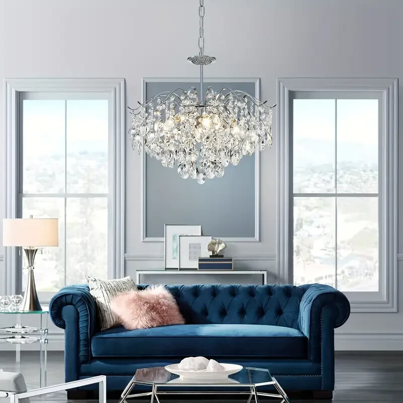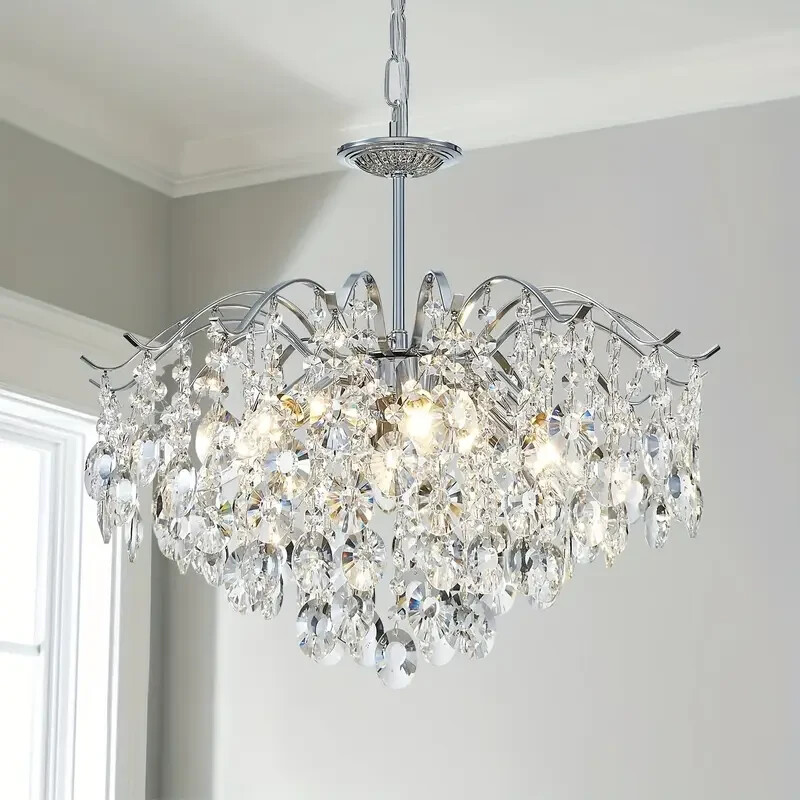 20 Inch Chrome Elegant Classic Crystal Chandelier 6-Lights Luxury Ceiling Lamp About this item 【Classic Luxury Design】Modern luxury meets classic beauty in the breathtakingly unique crystal pendant light. Hand-polished, multifaceted clear crystals shimmer like dewdrops in a curved metal light branches with a polishing silver finish, to create a charming and warm atmosphere in your any spaces 【Perfect Chandelier Size】Diameter of gold crystal chandelier is 20 inches, height is 33 inches (Max), Hanging Chain: 20 inches (Length is adjustable), Downrod: 8 inches, Canopy: 4.9 inches wide, pendant installation and semi flush mount installation methords to fit for your different ceiling height and requirements 【Bulbs Requirement】This crystal chandelier is compatible with E14 bulbs, 6 bulbs are required (Bulbs not included); Voltage: 110-120V, Max-60w, bulbs type: Incandescent,LED bulbs, energy saving bulbs, halogen bulbs etc. If installing dimming bulbs, it can display different lights with the wall dimmer switch to create different atmospheres 【Easy Installation】Assembly required and easy to install, with all mounting hardware and a mounting instruction included, It is recommended to hire technical electrician to install this chandelier light fixture 【Widely Application】The elegant silver crystal ceiling lighting fixture is a gorgeous centerpiece for living rooms, dining rooms, bedrooms, foyer, hallway, restaurant, entryway and other places, this crystal pendant light also can be hung from a sloped or vaulted ceilings. PRODUCT INTRODUCTIONS: Add a touch of elegance to your space with the dazzling sparkle of 6-Light luxury raindrop crystal pendant ceiling light fixture, which is the perfect lighting decor for the dining room, living room, kitchen island, bedroom, study room, cloakroom, foyer, corridor, office, etc SPECIFICATION: Style: Modern/Classic Material: Metal and K9 Crystal Color: Silver Light Dimensions: D20" x H33" (Max) (Height Adjustable) Chain Length: 20''- Adjustable Downrod Length: 8'' Canopy Width: 4.9'' Voltage:110-120V Light Source: 6 Lights Bulb base: E14 (Bulb Not Include) Light Bulb Type: Incandescent,LED,CFL etc Incandescent bulb be 60W max or LED bulb be 9W max Dimmable: Yes (Dimmer Switch Not Included) WARM TIPS: 1. Please check the dimensions before ordering, just to ensure it is suitable for your room. 2. Please check carefully the installation instructions before you are ready to install the chandelier. 3. Ensure the fixture is disconnected from mains power before installation. Payment Delivery details Return Contact us About us Payment 1.We accept PayPal,G Pay Credit Card,Visa ,etc. payment. 2. Please make payment within 4 days after placing an order, or eBay will automatically open an unpaid case on the fourth day. 3. You can contact us for sure if you want to cancel the order to avoid the unpaid case. Delivery details Your goods will be shipped within our handling time after your full payment. Pls note that we don't ship to Alaska, Hawaii and Puerto Rico.APO/FPO’s address. Return We accept return within 30 days, but we are not responsible for human damage.The return shipping cost is the buyer's responsibilities and try to keep it in your original package. Contact us If you have any questions please contact us through "Ask seller a question" link. We will respond within 2 business day or less. About us We are committed to providing you with a comfortable home and by functional and beautiful ceiling fans and lighting fixtures. As a professional modern lighiting fixture supplier, our team has more than 15 years Ceiling fan and lighting production experience. We are not only committed to produce high-tech, stylish, safe and high quality LED products, but also provide our professional and efficient after-sales service, making your lighting experience more pleasant and comfortable.