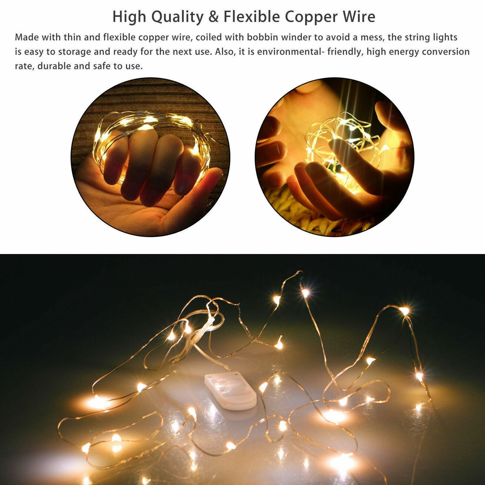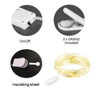 Features: 【Long life Battery Operated】: The mini string lights battery operated with on off switch, powered by 2 * CR2032 battery (included), Provides more than 72 hours lighting, the battery can be replaced easily. 【IP65 Waterproof】: The fairy lights is waterproof (battery box not), The Silver coated copper wire part can be put into water to achieve amazing atmosphere effects. Fully sealed make the fairy lights possible to use both indoor and outdoor. 【Flexible & Waterproof】: Your fairy string light is thin but sturdy, easily bend, twist and mould into any shapes that you desire. The silver wire is waterproof but not the battery boxes. 【Durable Material and Safe To Touch】: We insist on using high-quality materials for each of our mini string lights, since providing high-quality products to customers is the principle of our brand. Our copper wire mini lights using high quality 3V low voltage insulated line, which makes it cool to touch and safe to use, the soft LED lights will not harm children’s eyes. 【Widely Used】: Warm fairy string lights help to make a great ambience for every normal things, bendable silver wire can be easily built into the shapes you want. Led fairy lights perfect to decorate wedding, party, halloween, Christmas, bedroom, valentine's day, flowers, jars, vases, planting and other crafts. Easily carry and place the led fairy lights anywhere you like. Specification: Type:Fairy Lights Battery Operated Battery: 2*CR2032 (included) Color Temperature: 3000K Warm White Light Color:Warm White Length: 6.6ft LED Type: 20 Micro LEDs Lifespan of Battery: 72 hours Continuous Lighting Water-Resistance Level: IP65 Working Temperature: -4°F ~140°F Wire Material: Copper Wire Package Content: 10 X Fairy Lights