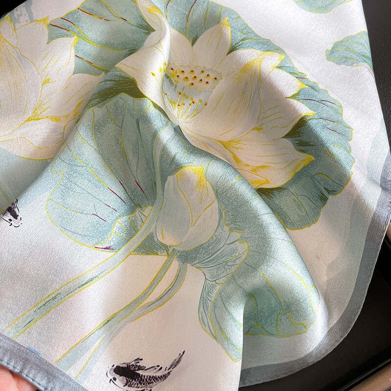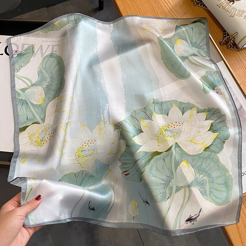 100% Silk Scarf Women White Green Flowers Kerchief Square Bandana Wrap 53*53cm