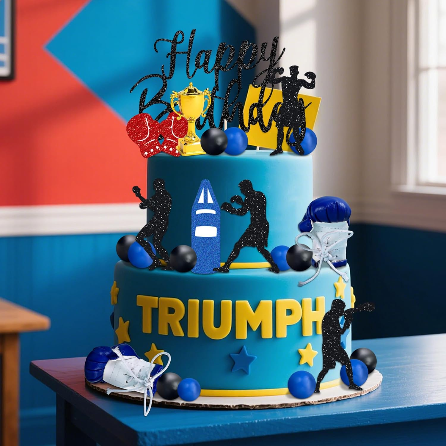 Boxer Birthday Cake Decoration will make anyone want to lace up their gloves and have a boxing-themed party! You will get: 6 x boxing cake decorations, 2 x boxing gloves cake topper, 10 x ball cake toppers(blue,black), 1 X trophy cake topper,1 X Happy birthday cake topper,Product size as shown in the picture! Adorn your dessert table with the perfect Boxing Party decor by adding this Fight Cake Decoration. Easy to assemble:You need spend 1 - 2 minutes to assemble. Product description