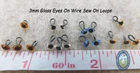 20 Pair Glass Eyes On Wire BENT INTO LOOPS 3mm or 4mm or 5mm For Sculpture, Carving, Polymer Clay, Needle felting, Arts & Crafts ON SALE because the loop is not embedded on both ends. One wire is embedded in the glass and bent with needle nose pliars into a loop. ON SALE while they last. See multiple photos of the eyes and the wire that has been bent into a loop. This Sale is for: 20 PAIRS of Glass Eyes On Wire BENT INTO A LOOP Choose Size 3mm or 4mm or 5mm in available Colors. Dimensions of Glass Eyes: 3mm (approx. 1/8 inch or 0.118 inch) Diameter 4mm (approx. 3/16 inch or 0.158 inch) Diameter 5mm (approx. 3/16 inch or 0.197 inch) Diameter Many Sizes, Colors AND Styles of Glass and Plastic Eyes, Noses, and Joints are available in GlassEyesOnLine eBAY Store Click on Links Below to Find Exactly What You Need Plastic Safety Eyes Glass and Plastic Doll Eyes Fishing Lure Eyes Glass Eyes On Wire Glass Eyes with Wire Loops Insertion Tools and Accessories Joints Noses On Sale YES, we combine orders for cheaper shipping. Foreign Taxes and / or Custom Duties are Not Included in International Shipping. Thank You for viewing this listing. You are invited to visit my eBay Store often for a large selection of Eyes, Noses, and Joints available for all your arts & craft projects.
