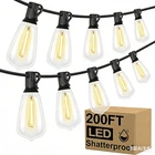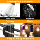 About this item Higher Quality and Lower Costs - You can place them in a larger area without worrying about length and frequent replacements. With a lifespan of over 30,000 hours, our energy-saving string lights will not only provide brighter lighting but also cut down on your electricity bills by 90% compared to incandescent ones. Weatherproof and Safer - Our weatherproof technology ensures that these durable outdoor string lights can withstand rain, wind, snow, and extreme temperatures up to 158 degrees Fahrenheit, allowing you to confidently leave them outside year-round. Furthermore, the bulb shells are made of hard anti-drop plastic, protecting you and your family while hanging the waterproof backyard string lights, eliminating worries about sudden broken glass shards. Classic Bistro Ambience - These vintage string lights come with ST38 tear-drop E12 bulbs that provide a nice, soft yellow glow without being too bright or too dark. These LED bulbs not only offer an old-fashioned appearance but are also compatible with most dimmers (not included, dimmer purchased separately) for better lighting flexibility. They are a great choice for creating your own outdoor paradise, where you can enjoy your time after a busy day or have a cozy party with your friends. Super Convenient and Widely Used - Hanging these LED string lights is a breeze with built-in hooks or zip ties. We have even improved the hooks, sockets, and cords to ensure that you can use our string lights without facing sudden breakage. These easy-to-use outdoor party string lights are fabulous decorations for your garden, bistro, balcony, terrace, pergola, gazebo, tent, pool umbrella, cafe, bedroom, living room, market, wedding, birthday, Christmas party, or other occasions.