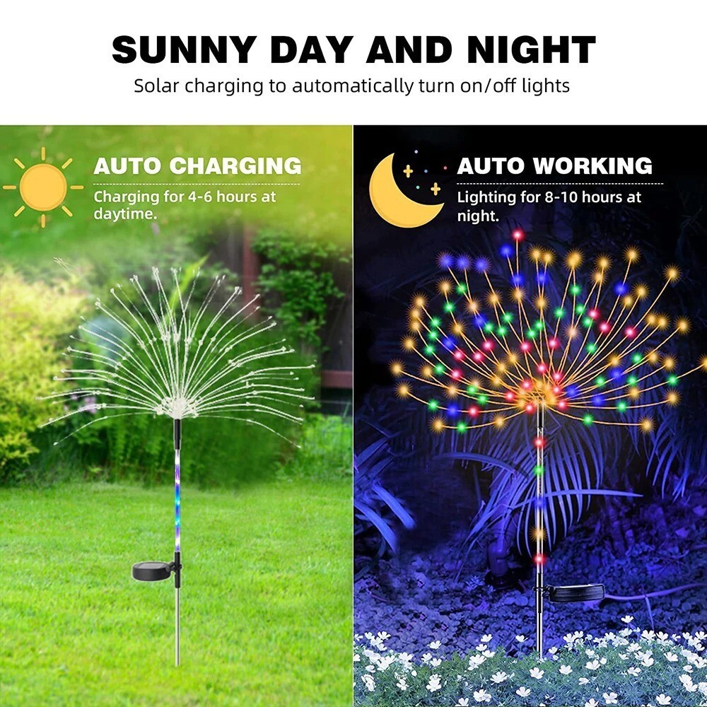 Features: 1.SOLAR POWERED: Automatically shuts off charging during the day and lights up when it gets dark. It is completely solar powered and requires no wires or external power, thus saving energy. 2. High quality and IP65 waterproof: 60/90/120/150/200 LEDs are brighter with more modelling possibilities. Copper wire material, ABS plastic, safe, high temperature resistant and shockproof. 3.LED BEADS: 5 lumens LED beads never overheat and are safe to touch, providing you with the safest lighting experience. 4.2 Lighting Modes: Normal + Blinking 8 lighting modes: Mode 1: automatic continuous change 2-8 modes; Mode 2: wave forward and backward; Mode 3: double light running horse; Mode 4: single light dimming; Mode 5: star blinking with running horse change; Mode 6: double light dimming at the same time; Mode 7: star blinking; Mode 8: full brightness. Choose the mode according to your lighting needs. 5.Ideal Decoration: These copper wires are very flexible, you can DIY your favourite shapes, such as flowers, trees, fireworks, Ferris wheels, hearts, spirals, spheres and so on. 6. WIDE APPLICATION: Suitable for decorating gardens, backyards, pavements, flower beds, fences and so on. It is also a unique decoration for Christmas, Halloween and Thanksgiving. Product Specification: Type: solar lawn light LED Quantity: 60/90/120/150 /200LED (optional) Light Colour: Warm / White / Colourful (Optional) Waterproof rating: IP65 Material:PVC+Metal Charging method: outdoor solar charging, about 6-8 hours Lighting time: approx. 8-10 hours Working mode: Light control sensor with switch Applications: gardens, courtyards, lawns, roads, swimming pools etc. Gardens, courtyards, lawns, roads, swimming pools etc. Package Included 1 x Solar Firework Light Payment About us Return and feedback Delivery time Pay attention Payment International Buyers – Please Note: a) Import duties, taxes and charges are not included in the item price or shipping charges. These charges are the buyer's responsibility. b) Please check with your country's customs office to determine what these additional costs will be prior to bidding/buying. About us We are pleased to offer the most up to date items at competitive prices. You can rely on us to deliver the most on demand products within short timescales. Return and feedback We hope you love our product but if for any reason you want to return it or you’re not fully satisfied with your new product, please contact only Via eBay Message ,please Do not open case or return or left negative and neutral feedback,we can solve it happily by messaging. Delivery time 1.Items will be shipped to buyer's eBay registered address. Please confirm your eBay address before you make the payment. We don't accept to revise address after you make an order. 2.Items location is in China, due to geographical distance, please be advised that the international shipping usually take longer than domestic. Pay attention 1.please make sure you write correct address,we are not able to revise address after you make an order. 2.item maybe come with several packages,please message us if you only get part of them or something missing. 3.if there has accident,please do not open return or item not received case or left negative and neutral feedback before you contact only Via eBay Message ,we are glad to offer reasonable solution.
