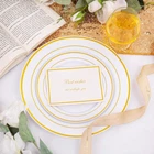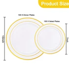 Healthy and Good Quality: We promise the materials of plastic plates for party are BPA free and no-toxic. These gold plastic plates are made of heavy duty and durable plastic, will not easily bend or break. If you want reuse these white and gold plastic plates, just simply wash them with water. Elegant Design:Our disposable plastic plates use the most classic and elegant design, white plates with gold rim, these plastic party plates will definitely give a deep impression for your guests at the event. Ideal for Any Occasions: This pair of gold disposable plates are suitable for dinner,dessert,salad,cake and appetizer. The elegant plastic plates are sufficient for 100 guests, also perfecting for parties, birthday, weddings, Thanksgiving, Christmas and others any occasions. Great Combination: You will receive a great plastic party plates set, including 100 gold dinner plates and 100 gold salad plates. After a fun,if you don't want waste you precious time, you can choose to discard these fancy wedding plates or reuse them. The decision is yours. Satisfactory Service: We use the strongest packaging to ensure that your heavy duty disposable plates can arrive with no damage. If you have any questions after receiving the package, you can us and we will give the most satisfactory answer for you.