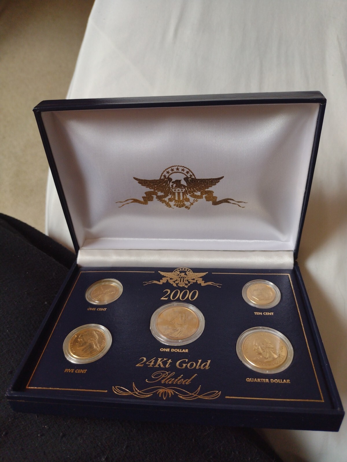 The product is a set of five uncirculated commemorative coins from the United States Mint, minted in 2000 in Philadelphia. The coins are 24KT gold plated and feature a modern silver/clad composition. Each coin is certified by the U.S. Mint with certification number 000371.
