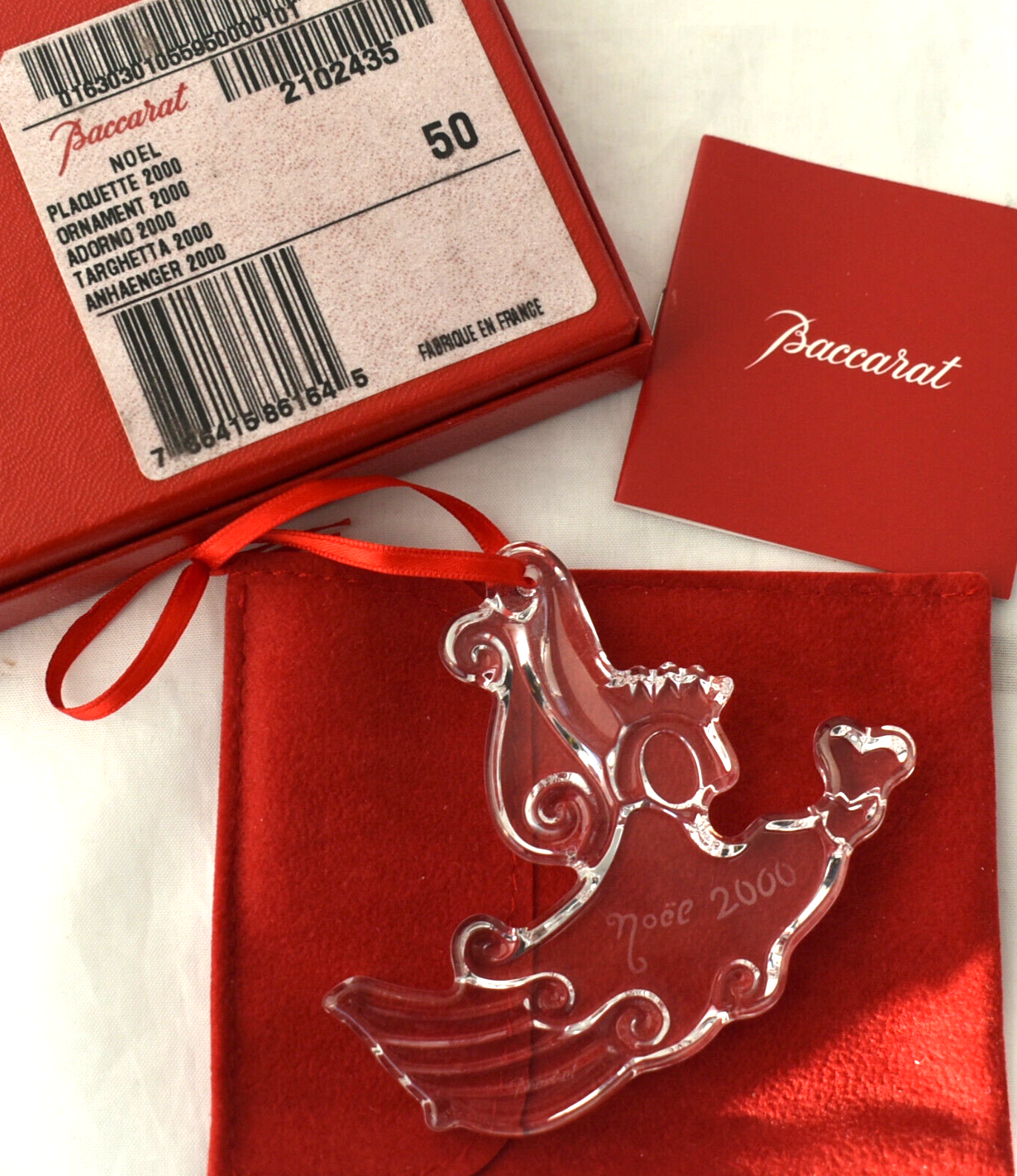 This features a beautiful clear crystal ornament of a flying angel holding a heart with the original box and brochure. Etched on body Noel 2000. Original packaging. Unsigned Mold Blown Etched Noel 2000 Approx 3” x 3" Original box & brochure Made in France Excellent condition See my other listing for a huge estate collection of extraordinary and very fine Christmas ornaments in glass and sterling silver collected from the 1970s until 2015. Check back often as it will take weeks to list the thousands of Christmas items. Shipping: We ship USPS, UPS or Fedex unless requested otherwise Return Policy: Please notify of return within three days of receiving. Return with original tags/security marks and in original received condition. International Buyers: Postage does not include any customs, duties or delivery fees.