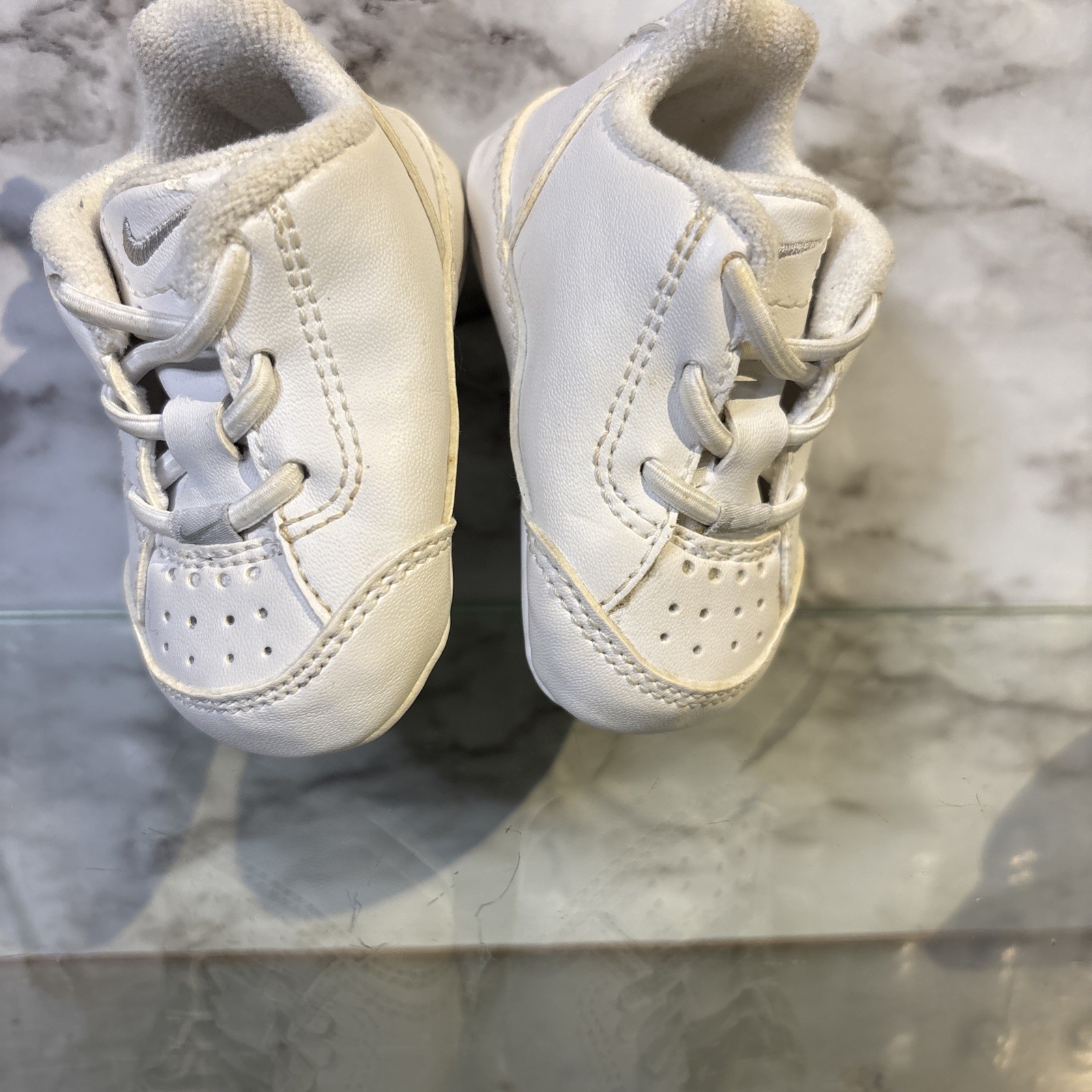 The product is a pair of vintage Nike Play Crib Shoes in unisex size 0C, featuring a white and gray color combination with a leather upper material. Manufactured in the year 2000 as part of the Nike Pico product line, these crib shoes are designed for baby boys and girls. With a UK shoe size of 1.5, US shoe size of 2, and EU shoe size of 17, these stylish and comfortable shoes are perfect for little feet in cribs. Made in Vietnam, these Nike crib shoes are a unique and fashionable choice for your baby's footwear collection.