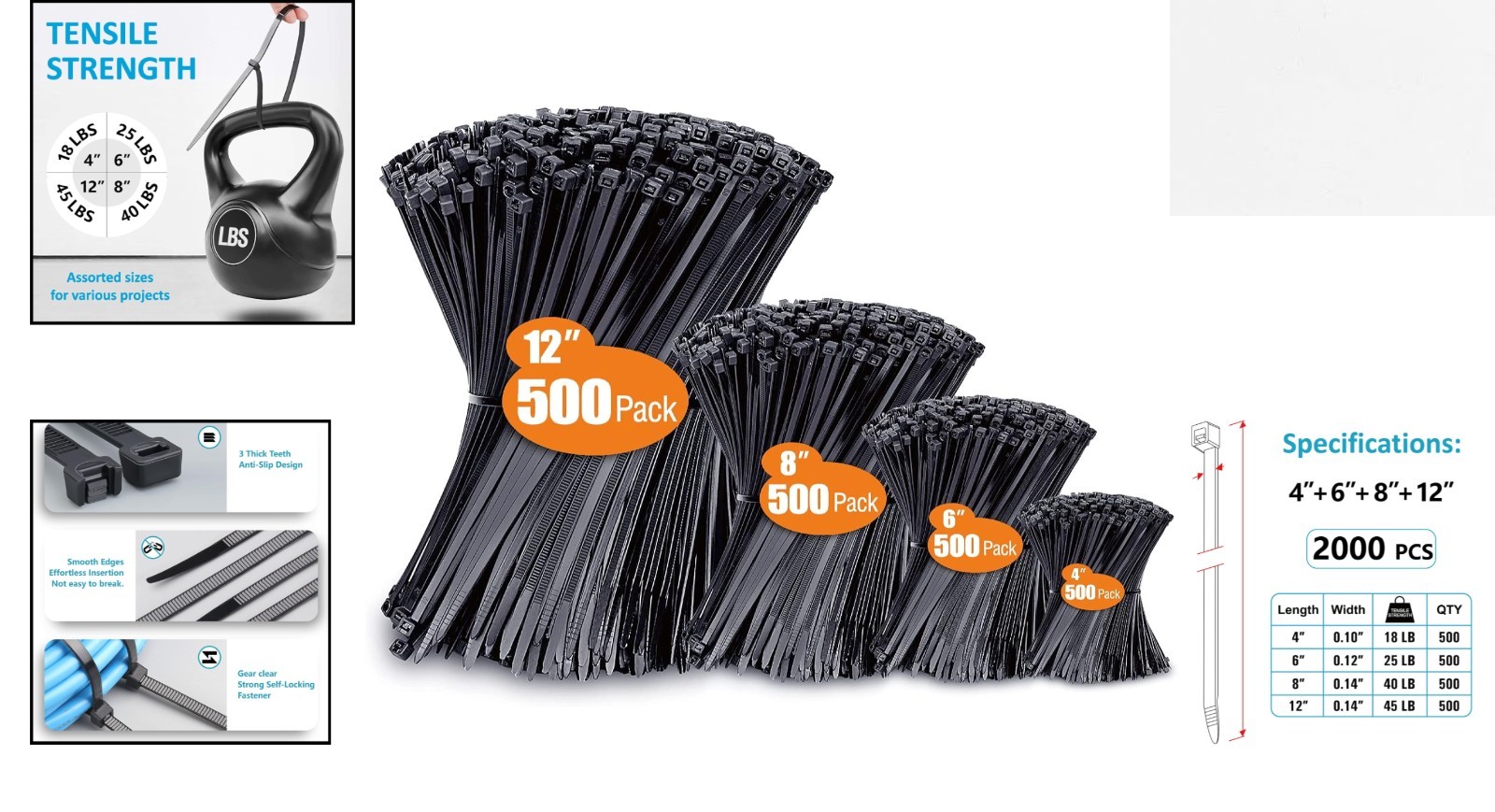 Black Cable Ties Assorted Sizes 4''-12'', 2000 Pack - Multi-Purpose ‹ › ‹ › ‹ › ‹ › ‹ › ‹ › ‹ › ‹ › ‹ › Black Cable Ties - Assorted Sizes 4''-12'' 2000 Pack - Multi-Purpose Use 4 Different Sizes: 4" (18 lb), 6" (25 lb), 8" (40 lb), 12" (45 lb). 2000 Pack Breakdown: 4" (500 Pack), 6" (500 Pack), 8" (500 Pack), 12" (500 Pack). Versatile Applications: Suitable for various situations—home, office, garden, garage, and more. Indoor & Outdoor Usage: Perfect for organizing electrical wires, hanging lights, attaching fences, and countless other tasks. Quality Assurance: Enjoy peace of mind with a 100% refund guarantee for any quality issues. Exceptional Quality & Durability Made from UV resistant, halogen free nylon 66, ensuring resilience. Optimal performance with a temperature range of -40℉ to 185℉ and UL94V-2 flammability rating. Higher tensile strength than competitors—18 lb (4"), 25 lb (6"), 40 lb (8"), 45 lb (12"). Wider ties: 0.1in (4"), 0.12in (6"), 0.14in (8" and 12") for secure hold. Self-locking design for ease of use and reliable performance. Ideal for Every Project Transform your organizational capabilities with our Black Cable Ties! With 2000 assorted ties at your disposal, you will never run out mid-project. From securing electrical wires in your home or office to organizing tools in your garage, these ties are designed for convenience and durability. Each tie features a self-locking mechanism that ensures a tight hold, while our high-quality nylon construction guarantees that your ties will stand the of time. Perfect for both indoor and outdoor use, these cable ties will be your essential tool for every need. Order your Black Cable Ties today and experience unparalleled quality and performance! Shipping Free & Fast Shipping - We offer free shipping to most of the USA with a normal delivery time of 3-7 days. However, due to the current situation, additional delivery time (up to 3 weeks) may be required for some items. Alternative Carriers - We may use alternative carriers (e.g. USPS, FedEx, UPS, etc.) to ensure your package arrives safely and on time. Due to the use of multiple carriers, we are unable to provide a tracking number automatically. Handling Time - Orders are processed and shipped within 1-2 business days of receiving cleared payment. Shipping Restrictions - Shipping to Alaska, Hawaii, Puerto Rico, Guam, and other US territories may incur shipping charges or delivery restrictions. Please contact us before ordering, or your order can be refunded/cancelled. State Restrictions - There may be restrictions based on your state of purchase. For example, certain items may not be shipped to California due to state regulations. Contact for Tracking Updates - If you require tracking updates or have any concerns about the delivery of your order, please feel free to contact us, and we will be happy to assist you. Return 30-Day Hassle-Free Returns - We want you to be completely satisfied with your purchase. If you are not, you can return the item within 30 days of receiving it for a full refund or exchange. Easy Return Process - To start a return, simply contact us and we will provide you with a prepaid return shipping label and detailed instructions. Restocking Fee - There are no restocking fees for returns. However, the buyer is responsible for return shipping costs if the return is not due to a seller's error. Refund Processing Time - Refunds will be processed within 5 business days of receiving the returned item in its condition. Payment We accept all major credit cards, PayPal, and Apple Pay for your convenience. Your payment information is secure and encrypted to ensure a safe and seamless transaction. Please complete your payment within 3 days of purchase to avoid any delays in shipping. Feedback Your feedback is extremely important to us. We strive to provide the best products and customer service possible. If you are satisfied with your purchase, please take a moment to leave us a positive review. If you have any concerns or issues with your order, please contact us before leaving negative feedback. We are committed to resolving any problems and ensuring your satisfaction. Contact Us If you have any questions or concerns, please feel free to out to our customer support team. You can contact us through the eBay messaging system. We are available Monday to Friday, 9:00 am to 5:00 pm EST, and we will do our best to respond to your inquiry within 24 hours. Buy it now and enjoy a pleasant shopping experience! Unit Quantity: 2000 Material: Nylon Features: Self-Locking,UV Resistant,Multi-purpose,Higher Tensile Strength Type: Cable Ties Color: Black Tensile Strength: 45 lb Item Width: 4 in Finish: Natural Item Length: 12 in Unit Type: Unit Number in Pack: 2000