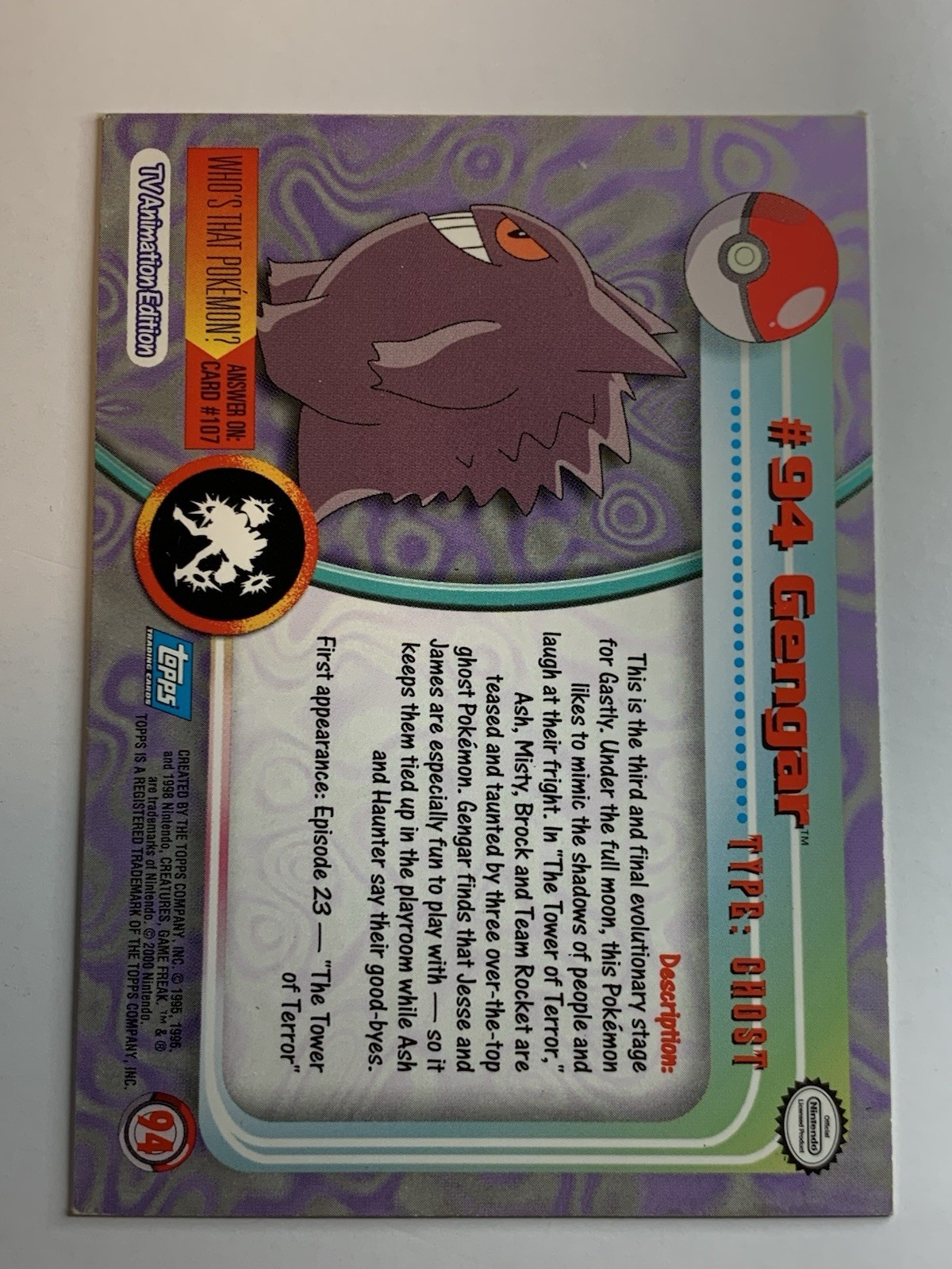 2000 Topps Pokemon T.V. Series 2 #94 Gengar Up for sale is a 2000 Topps Pokemon TV card. Please review the pictures as the card pictured is of the actual card that you will receive. The card will be placed in a penny sleeve and shipped in a cardboard box with delivery tracking. YES - I OFFER A COMBINED SHIPPING DISCOUNT. FOR "RAW" UNGRADED CARDS, YOU PAY THE SHIPPING COST FOR THE FIRST CARD AND ANY ADDITIONAL CARDS ARE SHIPPED FREE. IF YOU BUY 1 OR 100 CARDS YOU PAY THE SAME SHIPPING FEE. INCREMENTAL SHIPPING COST FOR PSA GRADED CARDS IS $0.50. I have 100% positive feedback and have been selling items on ebay for many years. Let me know if you have any questions or need additional pictures and I will be happy to provide them. Pokémon Official Trading Cards , informally known as Pokémon Trading Cards series 1 , was a set of Pokémon-themed trading cards manufactured by Topps in 1999. There were 90 cards in total: 76 Pokémon cards, 13 character cards, and a checklist card. Each of these 90 cards also had two foil card versions (silver and rainbow) in their main United States distributions. This set contained no bonus "chase cards". In the United States There were four different printings. These cards all had an oval Nintendo seal. The printings are distinguished by a blue, black, green, or red Topps logo, with card texts being updated between the first (blue) and second (black) printings. Due to an error, all foil cards after the first printing were printed with black logos, but can still be distinguished by the differences in their debossings. § 1st printing: blue logo on all cards, foil cards had a smooth texture with no debossings. § 2nd printing: black logo on all cards, Pokémon foil cards were debossed with rays and starbursts, while TV cards had a sandpaper finish. § 3rd printing: green logo on non-foil cards only, Pokémon foil cards were debossed with flames and teardrops, while TV cards had dots and rectangles. § 4th printing: red logo on non-foil cards only, Pokémon foil cards were debossed with Poké Balls and targets, while TV cards had dents. A fifth printing featuring foil cards with a smooth finish but a black logo (features of both the 1st and 2nd printings) was also produced to an uncertain extent. Pokémon Trading Cards series 2 was a set of Pokémon-themed trading cards manufactured by Topps in 2000. There were 72 cards in total: 41 Pokémon cards, 5 "Heroes & Villains" cards, 25 episode cards, and a checklist card. Each of these 72 cards also had two foil card versions (silver and rainbow). In addition, there were 27 bonus "chase cards" not included on the checklist, including 12 die-cut embossed cards, 10 animation stick-on cards, and 5 clear cards. Pokémon Trading Cards series 3 was a set of Pokémon-themed trading cards manufactured by Topps in 2000. There were 72 cards in total: 34 Pokémon cards, 12 "Heroes & Villains" cards, 19 episode cards, 6 puzzle cards, and a checklist card. Each of these 72 cards also had two foil card versions (silver and rainbow). In addition, there were 27 bonus "chase cards" not included on the checklist, including 12 die-cut embossed evolution cards, 10 pop-up cards, and 5 clear cards.