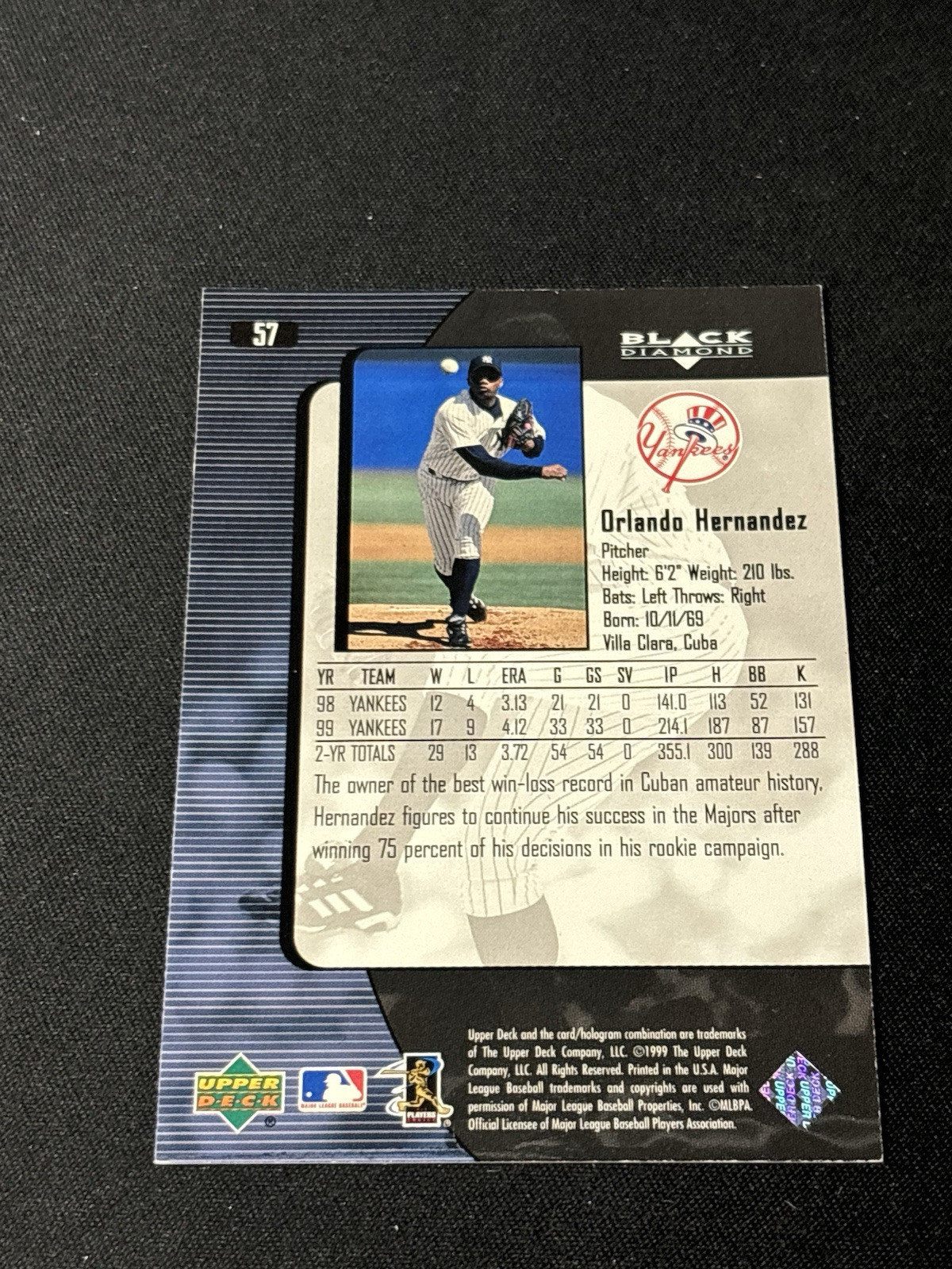 This 2000 Upper Deck Black Diamond card features Orlando Hernandez of the New York Yankees. The card is an original, vintage piece and is part of the Upper Deck Black Diamond set. It measures 3½" x 2½" and is in black parallel/variety. The card is in excellent condition and is perfect for any baseball fan or collector. The card is not autographed and is a great addition to any sports trading card collection.