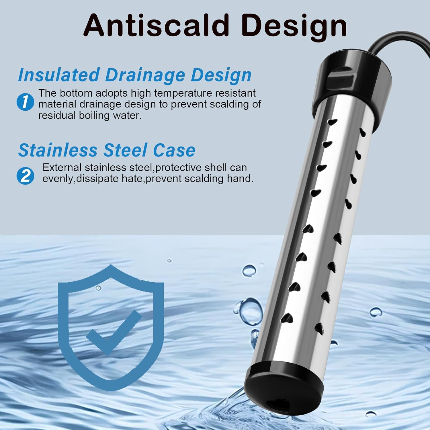 Fast Heating: The 2000W electric water heater features a porous design with excellent thermal conductivity. It will quickly heat 5 gallons of water with high power within a few minutes. If too much water is heated, it may take longer or require the use of two or more immersion water heater. Safety Design: Instant water heater, equipped with high-quality stainless steel protective cover, effectively preventing direct contact between heating elements and humans or animals, rust proof and safety. Our upgraded design ensures optimal performance. It is recommended not to use continuously for more than three hours and not to forget to unplug the power. Easy To Operate: Immerse the bucket heater in water at the appropriate level and plug it into any grounded 120V AC socket. Equipped with a digital LCD thermometer, it is easy to measure water temperature. Check the power indicator light to ensure that the immersion water heater is working properly. Note: When the portable water heater is working, people and animals should not be in the water. Widely Applicable: Immersion water heaters can be used not only in small inflatable swimming pools (multiple in use), but also in hot tubs, bathtubs, buckets, washbasins, camping showers, and more. This hot tub heater is easy to carry and ultra lightweight, making it perfect for travel and road trips. Packaging Includes: Before using the immersion heater, please carefully read the instructions and follow the precautions. Our portable water heater includes 1 pool water heater, 1 digital thermometer, 1 stainless steel cleaning ball, and 1 instruction manual. Product Description