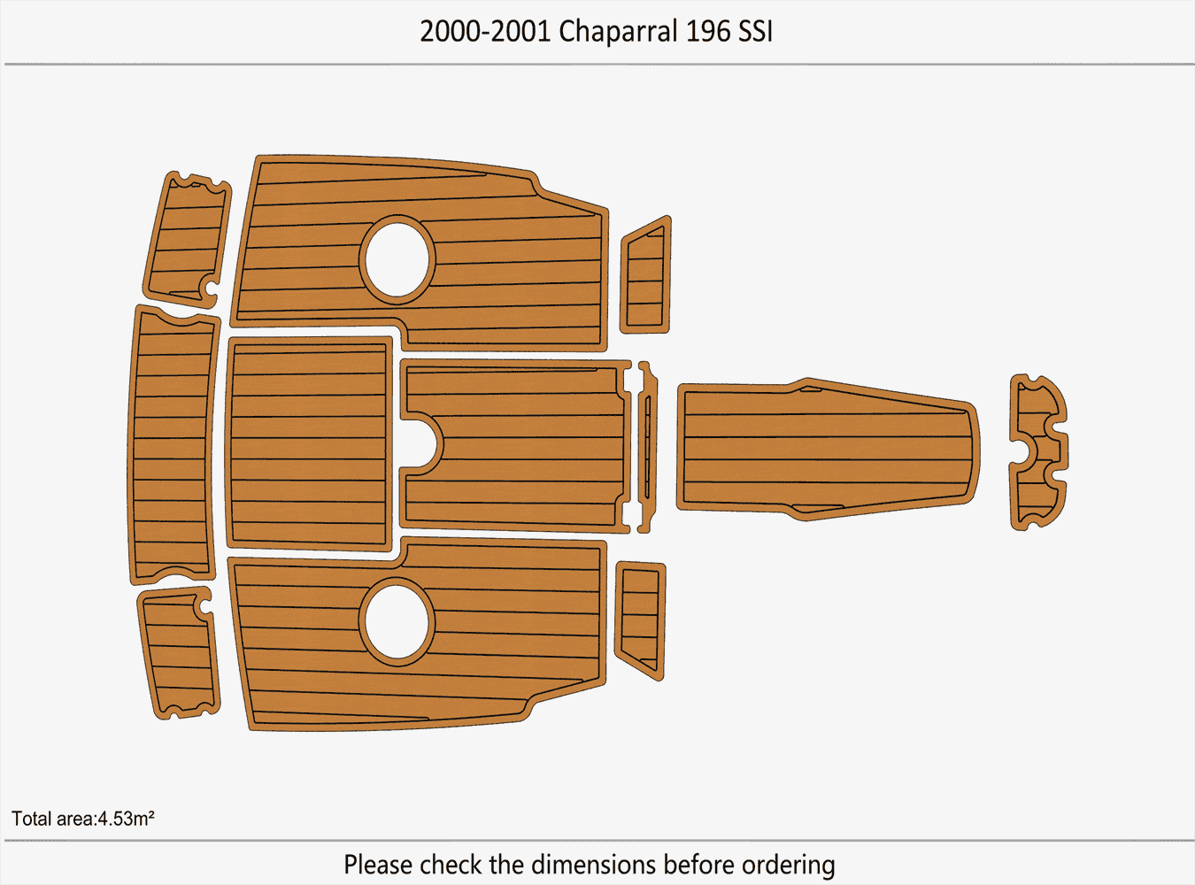 We could not add the 16 floor color options that you can choose to use to each listing because of quantity limit, when you order it, you can just leave an order note for the floor color that you want to use or you can send us a message, we will always check and confirm the floor color with you before we make the floor for you.You can just order it. Please be aware that we can only make this boat floor by the first listing drawing. Before you order it, please double check the listing drawing outline shapes with your boat to make sure they can fit your boat well. As long as the floor pad outline shape can match your boat deck layout, it should fit well.We will not be hold responsible if the listing drawing floors do not fit your boat well because you do not double check our listing drawing. We can only make sure that the floors will be cut exactly by the listing drawing. If you are not sure if the drawing can fit well with your boat, please send us some photos of your boat deck layout or a short video to show your boat deck layout from stern to bow so we can help you to confirm the fitting. The floor comes with marine backing adhesive.It is peel and stick installation.You just need to peel off the white protection paper and put it down. You do not need to buy glue to install it. We offer 1 year warranty for all our boat floors. The EVA floor is 1/4″(6mm) thick two-color pad. You can choose your colors, texture and faux teak option. Additional custom text logos can also be incorporated on EVA floor. All routed logos and beveled edges will show the bottom color selected. All EVA floors come with marine backing glue. All EVA floors listed on our online store are “made to order” and not stocked so please allow up to 2-3 weeks for delivery. EVA floor fabrication time is about 4-5 days, then it will take about 7-10 days’ time to ship and deliver to your order shipping address.After you order it, please double check your order shipping address to make sure all the shipping address, postal code, city name and contact phone number are all correct. We will ship all orders by express shipping such as DHL, FedEX, USP or EMS express. We will choose the shipping courier as we see fit. Color choices: #1 Black over Brown #2 Black over Dark Grey #3 Black over Green #4 Black over Red #5 Black over White #6 Brown over Black #7 Brown over White #8 Coffee over Black #9 Dark Grey over Black #10 Dark Grey over Grey #11 Grey over Black #12 Grey over blue #13 Grey over Purple #14 Grey over Red #15 Grey over White #16 Black over Blue When you order it, please tell us the color you want for top layer and bottom layer. Additional custom text logo fee:50 USD/ea. Before you order it, please verify floor drawing and confirm that it matches your boat and understand that this cannot be returned without a restocking fee of 30%. We can also make the custom EVA teak decking by the template drawing or full size template that you can supply to us. The listing price does not include any destination duties/taxes/custom fees/etc. that will be due when the product arrives at destination countries/regions. It is the customer’s responsibility to pay for all custom duty/taxes/custom fees if any. 1.EVA material is a high-density sponge, does not absorb moisture 2.No blackening/darkening in humid environment 3.Hardness: Around 55-50 degrees 4.Soft & Comfortable 5.Easy maintenance(Use of common cleaning agents, rinse with brush and water 6.High and low temperature resistance 7.Sound insulation and anti-vibration 8.Easy replacement,Easy installation,No additional auxiliary materials required 9.UV resistant without color fading 10.Support for customized services(Colors and patterns) Precautions before payment: 1.Please check if the boat model match your Yacht model。 2.Some ship models have different configurations with different options, please pay attention to choose the most suitable one 3.If not sure whether your ship matches the drawings, please send us photos of swim platform and cockpit, we could help to determine if it is appropriate 4..If need to verify the size, please feel free to contact us Order colors: 1.If request color not included in color cards, need to waiting the other 10-15 days. Parcels can be sent out within 20 days(Start from the moment of payment done), extend the cycle when it comes to holidays 2.The picture colors for reference only, based on actual color(Photos taken by cell phones easy to present the chromatic aberration) For design: 1.We could design drawings according to the customer’s requirements(Free of Charge) 2.We could provide design drawings for your choices 3.Support LOGO customization(50USD/ea), document is needed, format file: DXF/AI/PDF/JPJ/PNG etc. For Installation: 1.Need to use acetone or alcohol to clean the floor before installation(To remove surface wax of new ships), make sure it is dry before starting the installation. 2.Lay all EVA floors flat before installation. When confirming the location, tear off the backing adhesive from one corner and start the installation 3.Fix it when pasting, cannot move EVA floors 4.Rolling with round rollers during installation process(Need to finger press LOGO position in advance to avoid air in it). If air generated, remove it by use of a small needle to pierce the air bubble 5.No soaking within 48 hours after installation Making Templates: If no matching ship model in our sale list, pls provide template we could produce it based on your template’s requirement Reference image to create template Make a note in the package to remark contact details, name, the brand of small ship/model/year of production, we will contact you immediately We will send design drawings to you for confirmation within 5 days after template received Complete production and send package within 3-5 days after confirmation of drawings(after payment done) Package: Soft material. Rolled and packed for shipment. Outer box package Shipment Express courier: DHL FEDEX TNT UPS 