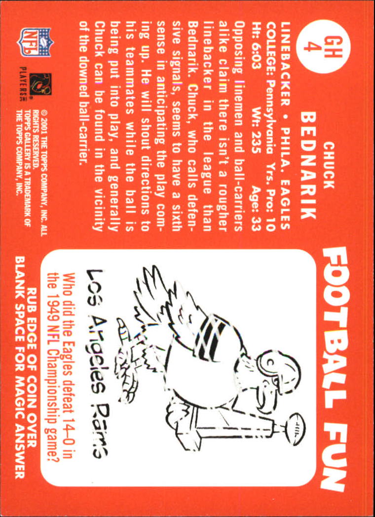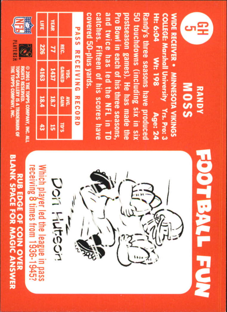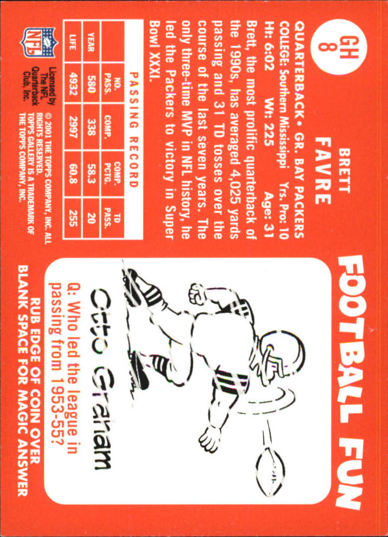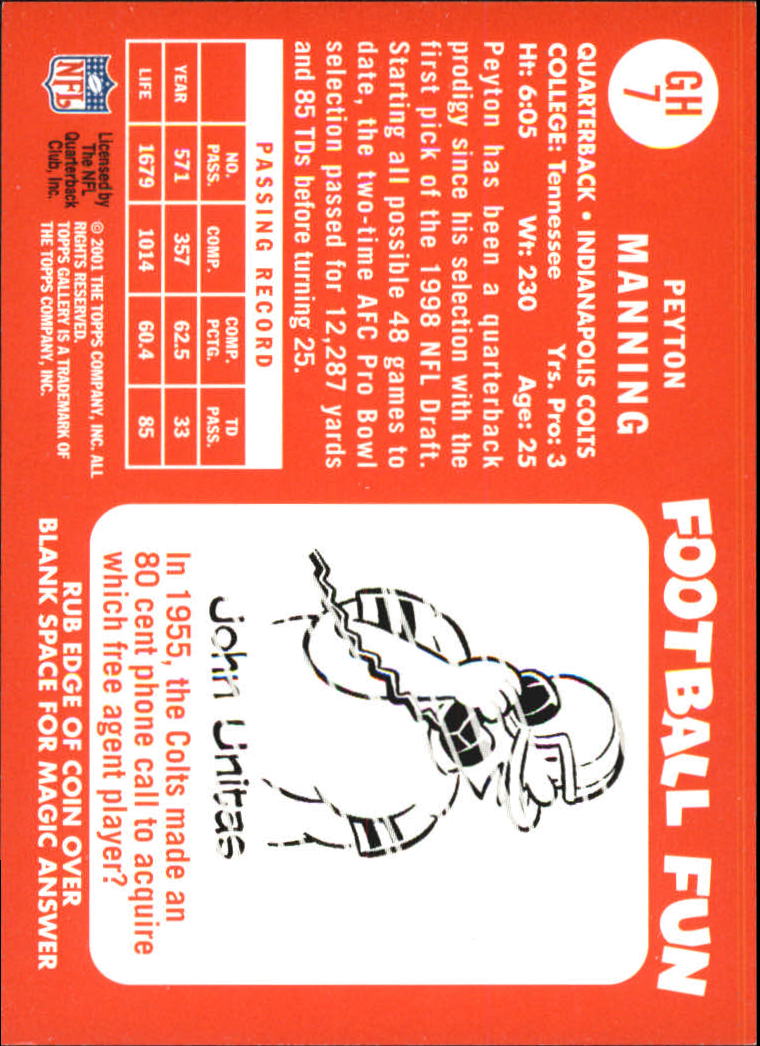 2001 TOPPS GALLERY FOOTBALL --INSERT CARDS --Joe Namath Bucks --Star Gallery --Heritage --Most Scans Are Stock Photos ********************************* --THIS IS A MULTI-VARIANT LISTING (MULTIPLE AND VARIOUS CARDS WITHIN ONE LISTING) --PLEASE SCROLL THROUGH THE "Choose From" DIAL TO MAKE YOUR SELECTION(S) --STOCK PHOTOS COME FROM THE BECKETT ARCHIVES AND CAN BE WRONG BUT SAVES 100'S OF HOURS. PLEASE REFER TO THE DESCRIPTION WHEN IN DOUBT. ACTUAL PHOTOS ARE AVAILABLE UPON REQUEST. --EBAY STANDARD SHIPPING (PWE) IS THE DEFAULT SHIPPING. I ALSO OFFER USPS GROUND ADVANTAGE IN A BUBBLE MAILER SHIPPING FOR $4.50. ****PLEASE CHOOSE THE CORRECT SHIPPING METHOD WHEN CHECKING OUT. EBAY STANDARD SHIPPING (Plain White Envelope) HAS ITS LIMITS. 1-15 CARDS (DEPENDING ON THICKNESS OF THE CARDS), VALUED $20 AND UNDER AND MAXIMUM WEIGHT OF 3oz.**** --I CAN ONLY COMBINE SHIPPING PRIOR TO PAYMENT. IF THERE IS AN ISSUE WITH YOUR TOTAL, REQUEST A NEW INVOICE. ONCE PAYMENT IS MADE, CHANGES CAN NOT BE MADE. IF YOU GENERATE MULTIPLE ORDERS, YOU WILL GET MULTIPLE SHIPMENTS. --IF THERE IS AN ISSUE WITH YOUR ORDER, PLEASE LET ME KNOW? I TRY AND MAKE YOUR EXPERIENCE WITH SIMICARDS EASY AND QUICK, BUT ISSUES DO OCCUR AT TIMES. THANK YOU, TONY
