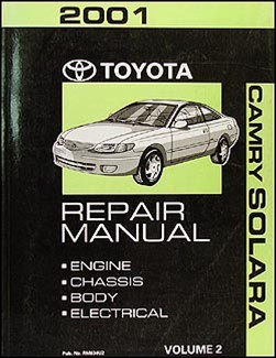 Item Description Written for Toyota dealership mechanics, this set of 2 factory-published original manuals shows you how to work on your vehicle. With step-by-step instructions, clear pictures, exploded view illustrations, schematics, and specifications, you will have the information you need to get your project on the road and keep it there. Buy now to own the best manual set for your vehicle. Item Specifications Exact Title: "2001 Toyota Camry Solara Repair Manual" author: Toyota Wiring Diagrams?: Sold Separately Authenticity: This item is original. Dimensions: 11.00 x 8.50 x 3.75 OEM Part Number: RM834U Pay Media Mail shipping on 1 item, get FREE US shipping on 2nd item if shipped together. Find more in our store Click here for more 2001 Toyota Solara manuals. Model-Year Application Covers all 2001 Toyota Camry Solara including SE Coupe, SE Sports Coupe, SE Convertible, SLE Coupe, and SLE Convertible. 2001 Toyota Solara SE Coupe 2-Door 2001 Toyota Solara SLE Coupe 2-Door 2001 Toyota Solara SE Convertible 2-Door 2001 Toyota Solara SLE Convertible 2-Door Shipping Policies Shipping U.S. Super saver postal media mail with delivery confirmation is the lowest-priced option. Media mail typically takes 7-14 business days to arrive in the continental US.. To AK, HI, PR, and APO, media mail takes a month so we recommend priority mail instead. Optionally, get this item sent to the US via postal Priority Mail with delivery confirmation for an additional cost (see details by shipping price). Please request a quote for combined Priority Mail shipping, since multiple items may require extra shipping costs. Shipping Overseas Economy shipping does NOT include tracking. Standard shipping usually includes tracking. International shipments typically take 1-3 weeks for delivery, but can take longer. Please supply a phone number with your order to ensure timely delivery of your package. Shipping Canada Shipment to Canada includes tracking. Shipment to Canada typically takes 2 weeks for delivery. Hours Open 7:30 am to 4:30 pm pacific time weekdays. Closed Saturdays, Sundays and holidays. Finally, Buy With No Risk from the Auto Literature Experts Pledge of Honesty We are a high tech company with old-fashioned integrity. Our Promise of Value: When you buy from Faxon, you know that the book you get will cover the years and content listed in the long description. We got to be the largest sellers of out of print auto books by becoming the experts on what you need to get your project on the road. Our Assurance of Security: We have never sold or shared a phone number, email address, or street address. We have never had a credit card number stolen. Your personal information is safe with us. Backed by More than Forty Years of Professional Experience: For more than forty years, we have been researching auto literature. We have built a library of rare manuals and compiled lists of manuals that exist. No other company has invested so much time and effort to find the best book for your vehicle. We buy from every major printer in the US in order to offer you the finest quality books and the best selection anywhere. Powered by SixBit's eCommerce Solution