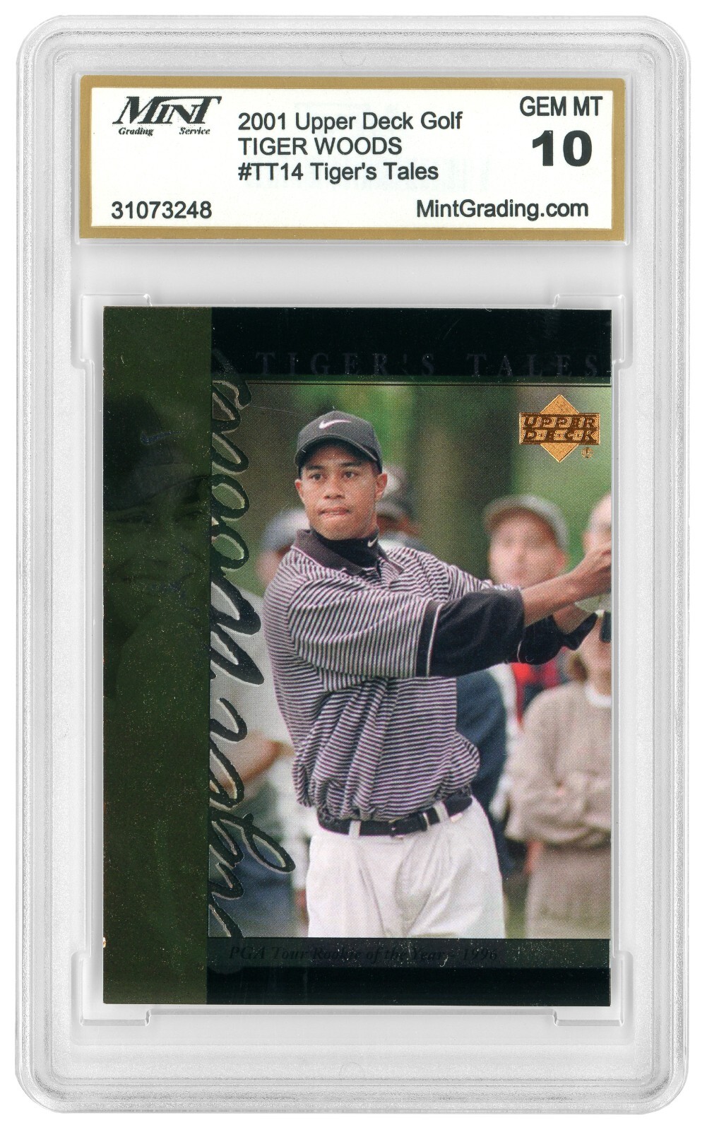 Hello and thank you for your interest in this graded sports card from Uncle Ray's Sports Cards ! Don't forget to take a quick look at our other items too. **************************** This is the 2001 Upper Deck Golf card #TT14 of Tiger Woods "Tiger's Tales: PGA Tour Rookie of the Year - 1996" . This 22-year-old card looks great with vibrant colors both front and back including a front foil look. The card was graded by Mint and received a Gem Mint 10 grade. The grading certification number is 31073248. We ship our cards same day or next day after payment has been received . Cards will be securely shipped inside a resealable sleeve, inside a waterproof bubble mailer for extra protection. If you have any questions about this card, please contact us for a fast and friendly response. Thank you. **************************** ABOUT OUR CARDS: We want you to buy from us with confidence. That's why we take high resolution images of all our cards ourselves. The images you see in this listing are of the actual card you will receive (we never use stock photos). Please inspect the images closely before buying to make sure you are satisfied. ASK US ANYTHING: We are here to answer any questions you may have. Please contact us by selecting "Contact seller". You are welcome to contact us with any questions about this card's condition, or to ask for additional pictures. WE COMBINE SHIPPING: Purchasing multiple cards? Add all the cards you want to the shopping cart and then checkout. Ebay will automatically combine the shipping cost. RETURNS ALLOWED: For your convenience, we accept returns within 30 days of purchase as long as the card is received by us in the same condition it was sent to you. The buyer is responsible for return shipping costs.