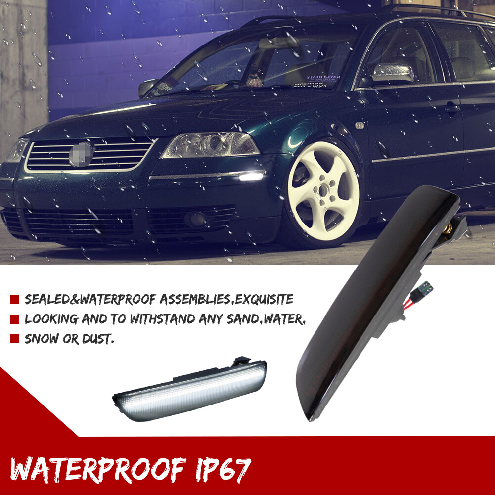 2X Smoke White LED Front / Rear Bumper Side Marker Light For 2001-2005 VW Passat 2X Smoke White LED Front / Rear Bumper Side Marker Light For 2001-2005 VW Passat This auction features one pair (2 pieces) of brand new smoked black lens white LED front or rear side marker light lamps For 2001-2005 Volkswagen Passat B5.5 Each lamps powered by 24-SMD white LED chips for super brighter lighting. Use this pair of LED front side marker lights to easily replace your car's stock side marker lights for a much brighter and noticeable rear end as your back up reverse. The enhanced brightness elevates your car's presence and aura by adding additional safety and visibility features, while increasing its visual appeal. Installation is plug and play with no modification required. ☛Feature: 100% Brand new and quality Smoked lens LED Color: White 2PCS/Set. ( NOTE: You need to buy 2sets if you want to replace them for front & rear side markers) Good for 2001-2005 Volkswagen Passat B5.5 Replace OEM Part #: 3B0-941-071A 3B0-941-072A Interchange Part # : VW2861103 VW2860103 Powered by 24-SMD LED emitters with white LEDs for tail end Built-in CAN-bus, Error free Plug and play installation with no modification required DOT SAE approved Replace the original amber/red lens stock with LED strips lamps in smoked lens Enhance your car's presence and aura by adding additional safety and visibility features ☛Specification: T ype of Lights: LED front / rear side marker lights/fender flare lamps Material: Durable Black & ABS Waterproof: IP67 Lens color: Smoked Light color: White Installation position: Front / Rear Side Marker Lamps Ultrasonically sealed Work Temperature:-40 - 60 centigrade degree Voltage:12-24V DC; Power: 3W L ow power consumption; Quick Instant Start-Up time ☛Fit for: For 2001 2002 2003 2004 2005 Volkswagen Passat B5.5 Please make sure you have available space in your car for these lights to fit before placing order. ☛Package included: 2pcs Front / Rear Side Maker Parking Lights ☛Installation: Direct replacement, plug and play with no modification needed Note: Professional installation is highly recommended! Payment Delivery details Terms of sales Contact us Feedback Payment We only accept payment via PayPal. Please make sure shipping address on your PayPal account is correct and up-to-date. Payment from bank account and all major credit cards will be accepted through secure payment processor PayPal. Delivery details Item will be shipped to buyer's PayPal shipping address within 1 business day after clear payment received. Tracking number of domestic orders will show up on buyer's eBay account once order is shipped. Please make sure shipping address on your PayPal account is correct & up-to-date. All of our items are shipped from our GA, USA warehous e. * Please note that post office doesn't process parcel on Saturday, Sunday & public holidays. Terms of sales Warranty policy: This item comes with 60 day exchange (replacement) warranty. Buyer could choose exchange to same item or apply store credit to other items in our store. Exchange will be processed after we received return. We only accept refund request for un-opened or un-used item, buyer has to return item in original condition and retail package within 30 day. 20% restocking fee will be deducted for all refund cases. Refund will be processed after we received return. Buyer is responsible for return shipping cost of ALL exchange/refund cases. We will cover shipping cost when sending out replacement. Products that are modified/customized are NOT covered by our return/exchange policy. Compatibility issue: Please check actual stock bulb model & housing size before purchasing replacement bulbs. Compatibility list on eBay listing is not a complete list and it is a known issue that there are errors on it. If you encounter model/functional compatibility issue, please contact us for assistance. We will help you exchange to compatible item (if available). We only accept refund request if we don't carry compatible item. 20% restocking fee will be deducted for ALL refund cases. Buyer is responsible for both return and resend shipping cost when exchanging an item with compatibility issue. We will cover resend shipping cost if compatibility problem is directly caused by incorrect information on listing. Buyer will be charged for price difference when upgrading to a more expensive model. Contact us Should you have any question/concern regarding our item/auction, please feel free to send us an eBay message. We will answer your question in a timely manner (within 12 hours in most cases). Reply will show up on your eBay account and goes to the email address associated with your eBay account. If you don't receive our reply within 2 business day, please kindly check your junk-mail box. If you are interested in bulk order, please contact us for a quote. Feedback We appreciate your business and strived to improve our customer service and our commitment to quality. We will leave a positive feedback immediately after payment is received. We appreciate a positive feedback as much as you do. If for some reason there is any issue with the purchase, please contact us prior to leaving feedback, and we will be glad to work with you to have it resolved. On Mar 12, 2025 at 21:05:54 PDT, seller added the following information: