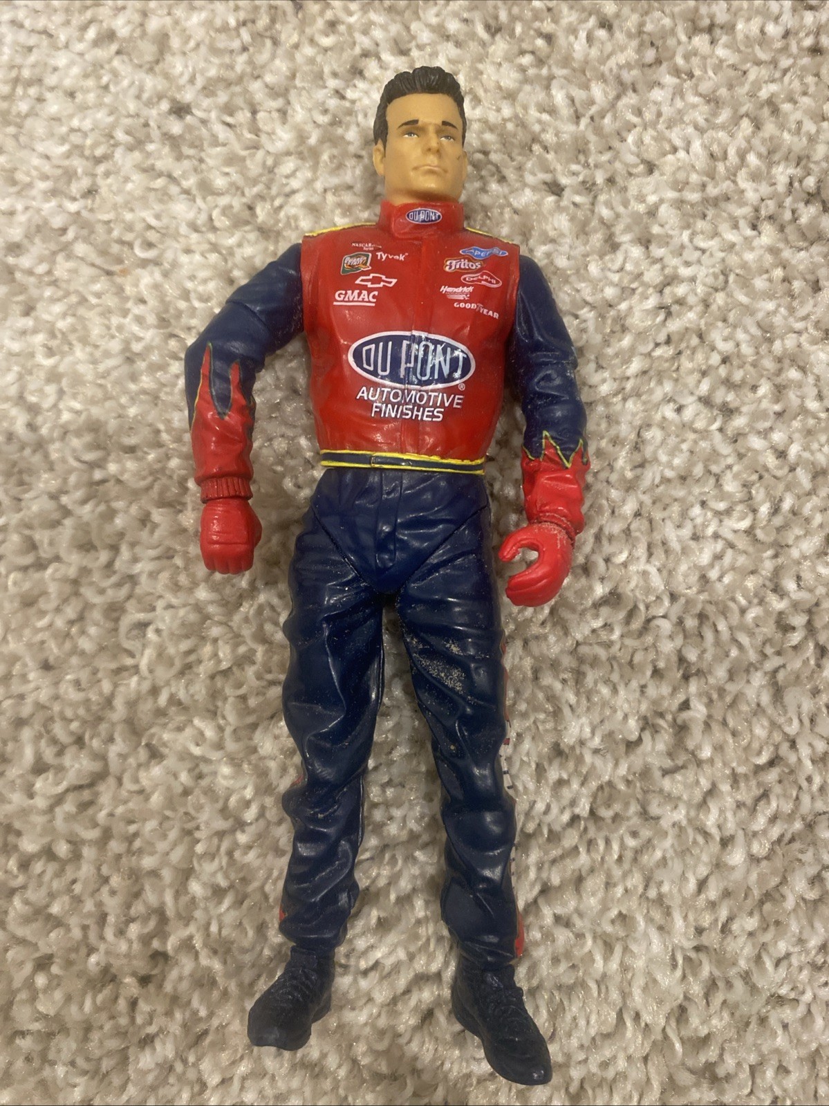 The product is a 6-inch Road Champs NASCAR Jeff Gordon DuPont action figure from the year 2003. This collectible item features Jeff Gordon, a prominent character from the NASCAR era, and is manufactured in China. The action figure depicts Gordon in his racing gear, making it a must-have for fans and collectors interested in NASCAR memorabilia.
