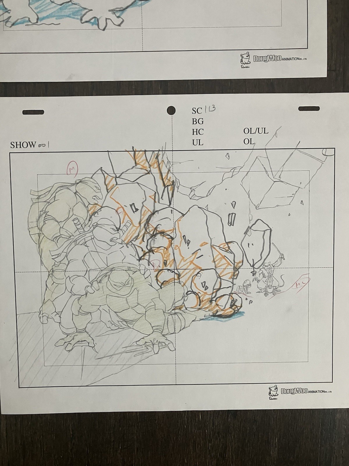 Own a one of a kind piece of TMNT history Hand drawn sketches originally from Seoul & the animators behind the 2003 TMNT animated series Dozens of hand drawn papers depicting scenes from season 1 Episode 1 entitled “Things Change” Picture included to show final animated product from ep 1 Scenes involving the turtles as well as Splinter being attacked by mousers Also included in this incredible lot is a production rundown/shot list as well as original envelope Dong Woo Animation Please reach out with any questions Over twenty years old perfectly preserved!